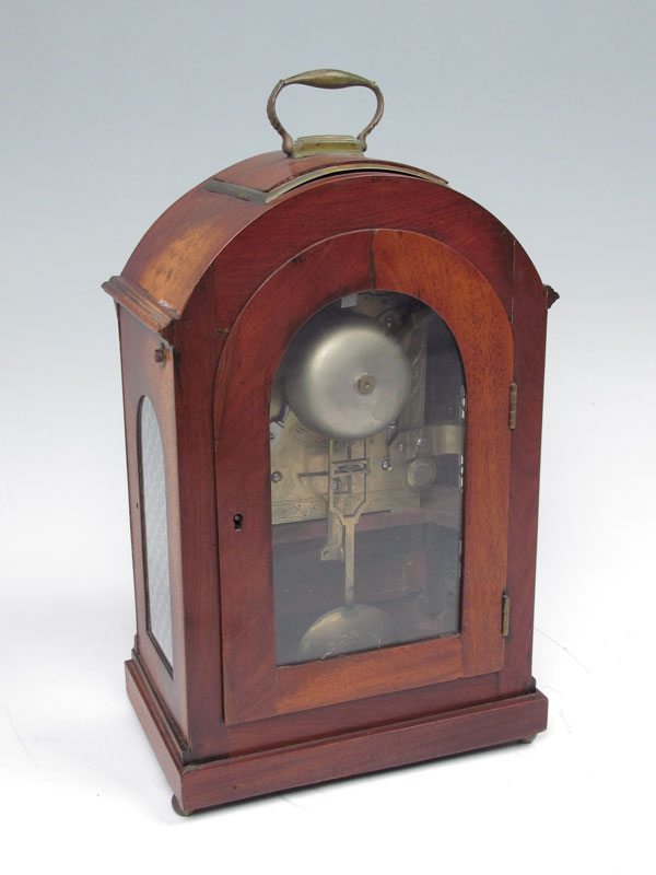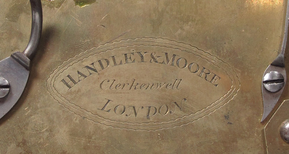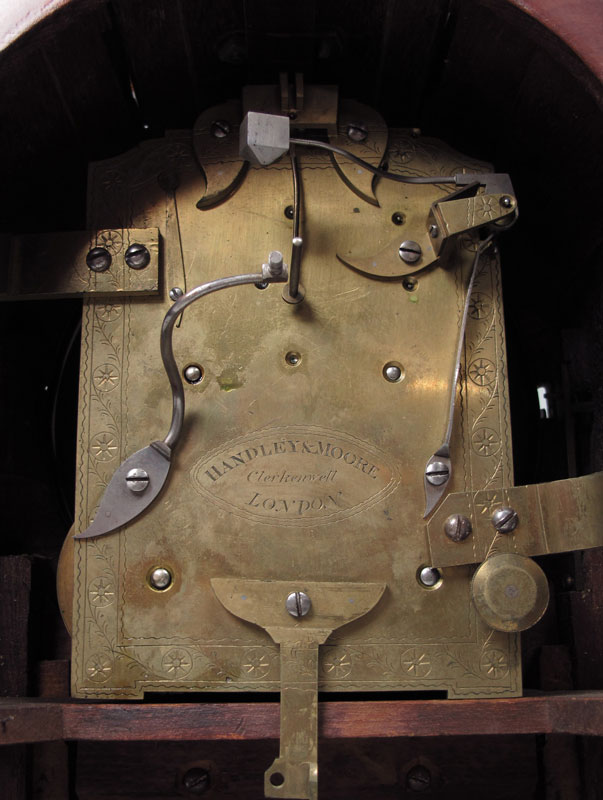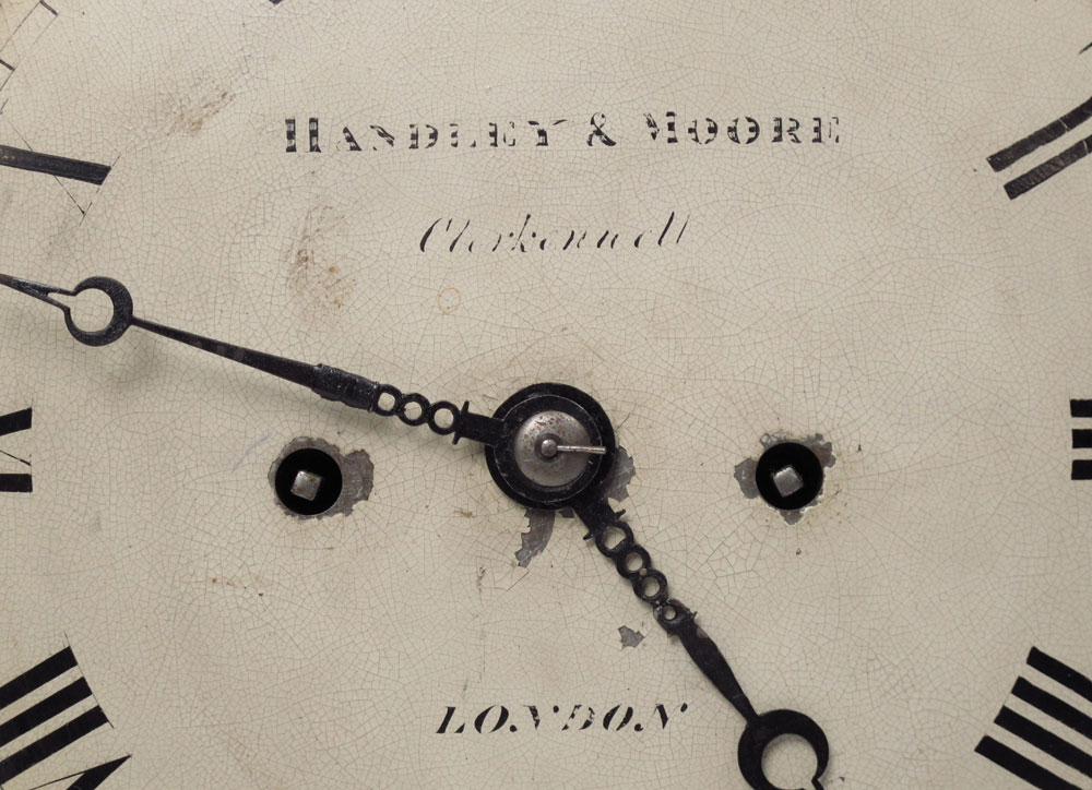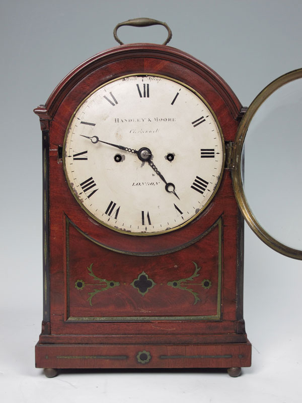 19TH CENTURY HANDLEY AND MOORE BRACKET CLOCK: Early 19th century mahogany case with bracket handle and inlay. 7'' painted metal dial marked Handley & Moore, Clerkendell, London with Roman numerals. Twin fusee time and strike movement with engraved and marked backplate. Engraved pendulum. Key to movement in office, missing key to case. Measures 14 1/4'' h. x 9 3/4'' x 6 1/4''.