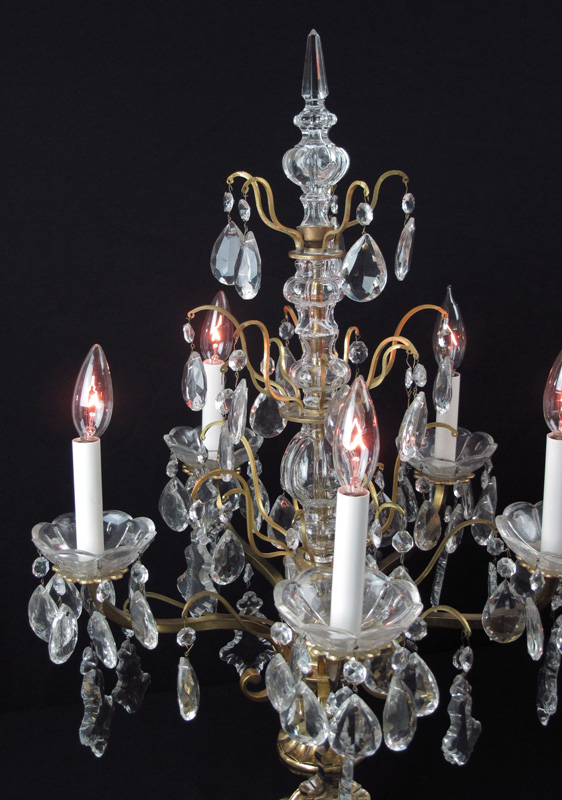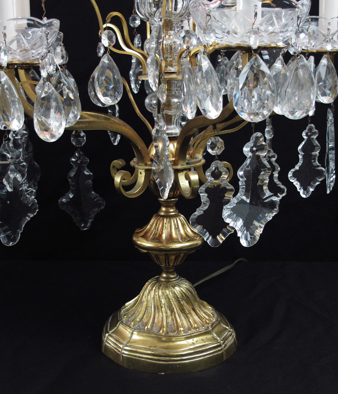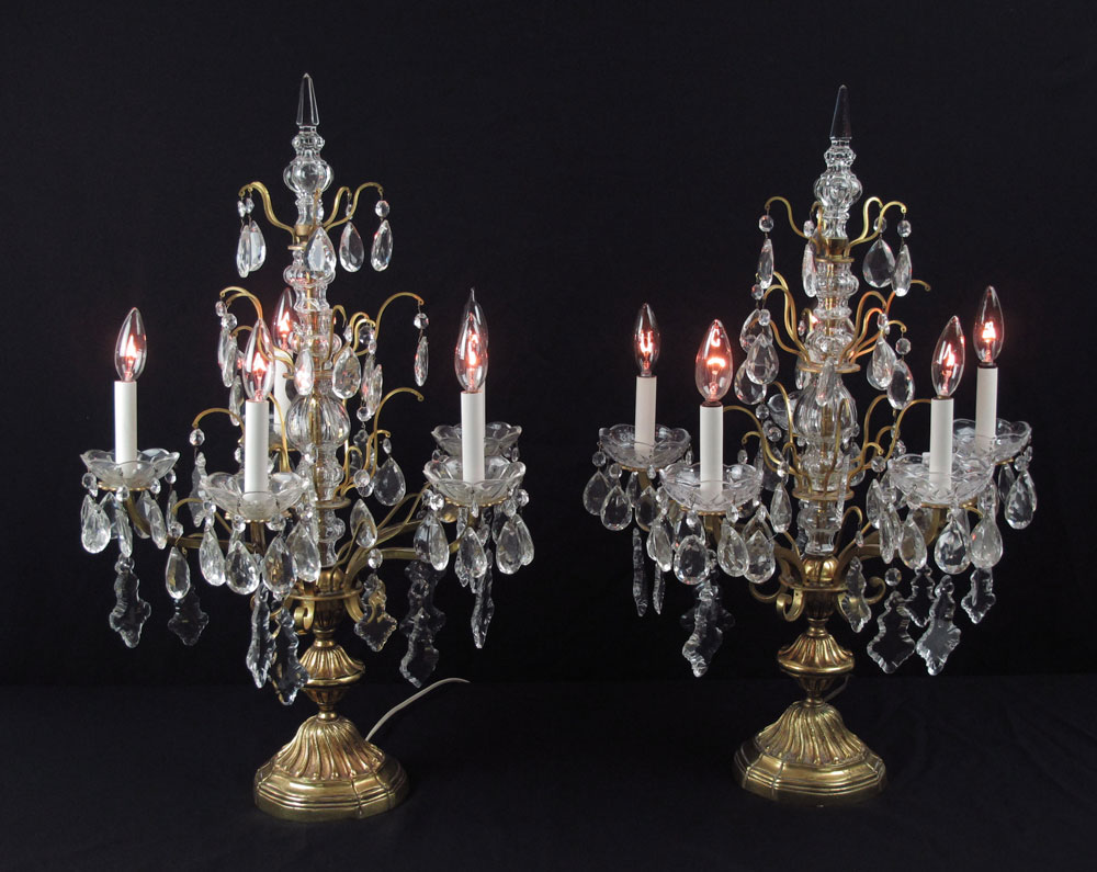 PAIR TABLE TOP CHANDELIER LAMPS: 5 light brass bases with center crystal decoration, spire finials, hanging prisms. 29 1/4'' h. x 18 1/2'' dia.
