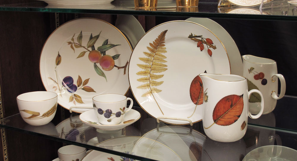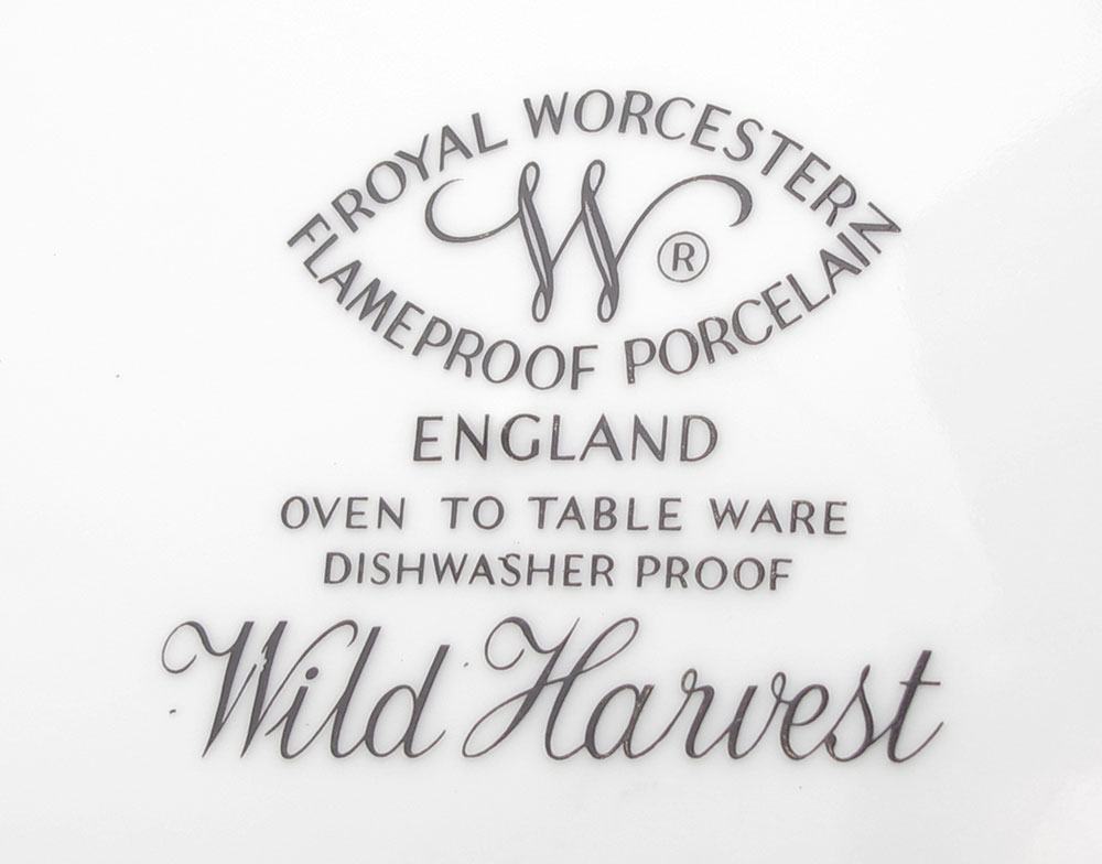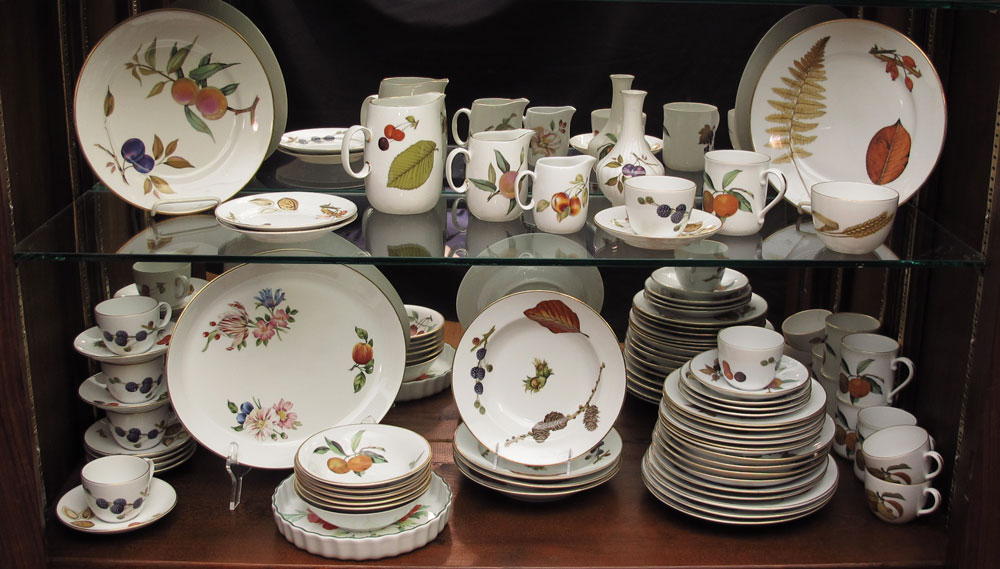 ROYAL WORCESTER WILD HARVEST AND EVESHAM CHINA: An assembled collection of 2 similiar patterns. approx. 59 pieces total, to include 5 plates (10''), 6 plates (9''), 6 plates (8 1/4''), 5 bread plates, 8 teacups and saucers, 4 coffee mugs, 4 bowls (9''), 6 bowls (9 5/8''), oval platter (13'' x 11''), ruffled rim open vegetable (9''), 3 graduated pitchers (largest 5 1/2''), vase, open bowl.