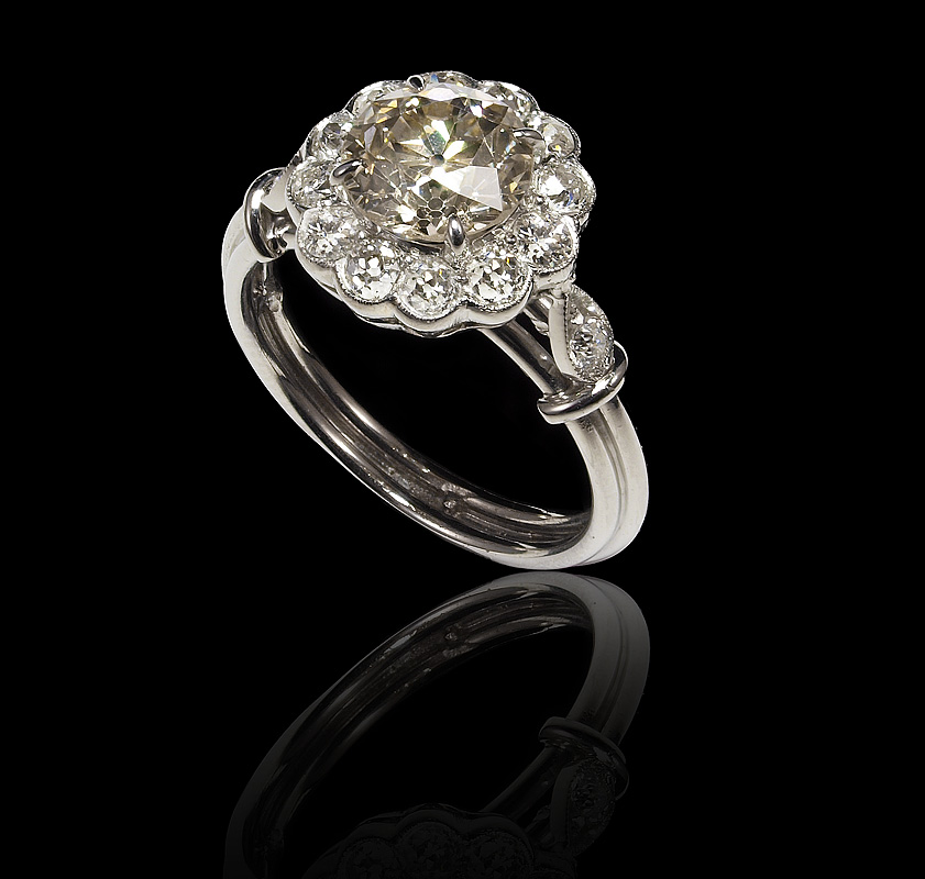 PLATINUM 2.08 CTW PERIOD OLD EURO DIAMOND RING: Beautiful platinum ring centers an old European round diamond of approx. 1.68 Ct., rated SI2 in clarity and top light brown color. The center stone is framed in diamonds, approx. .40 Ct., averaging G-H-I color and VS in clarity, Size 6.5. weight 6.4 gram. Sold with current Atlanta Gemological GIA graduates appraisal for $8,950.