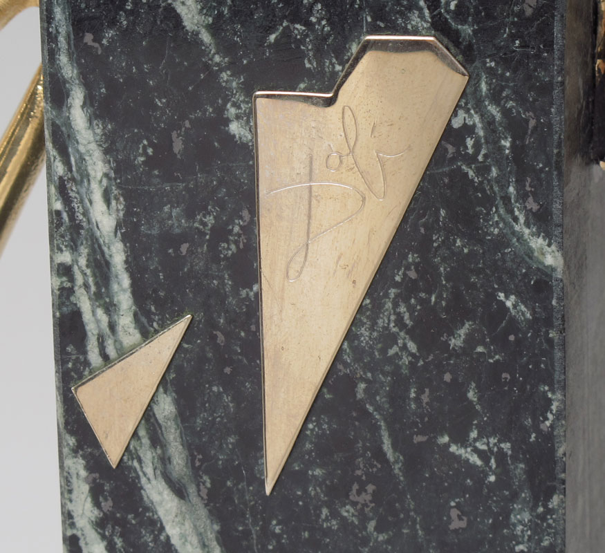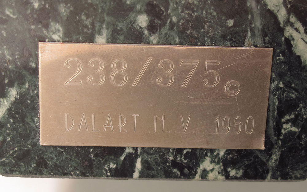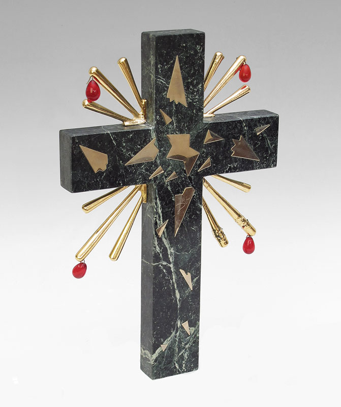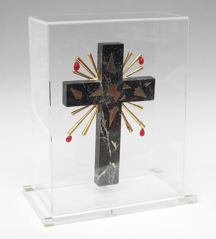 DALI, Salvador, (Spanish, 1904-1989): ''Crucifixion'', Italian Marble, applied Brass and Red Lucite, 14 1/2'' h., 9 1/2'' w., numbered 238/375, signed, custom plexiglass display (repair to one bottom corner, barely visible), 18 3/4'' h., 16'' w., 9'' d., with COA and copy of original advertising paperwork, 1980. Acquisition price at the time was $10,000.00.