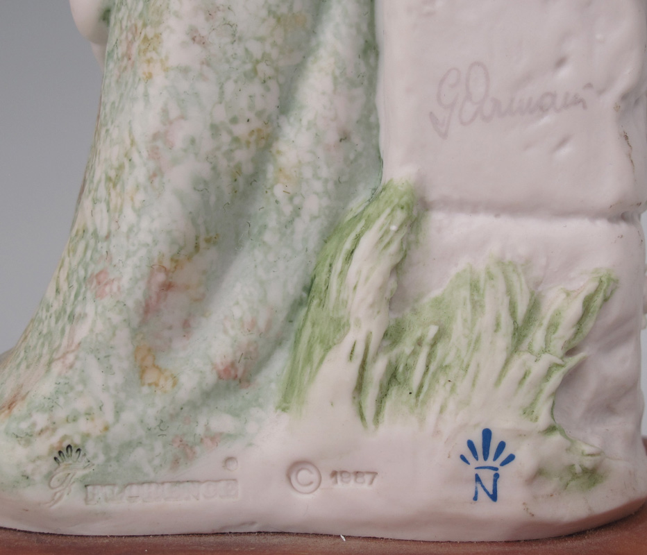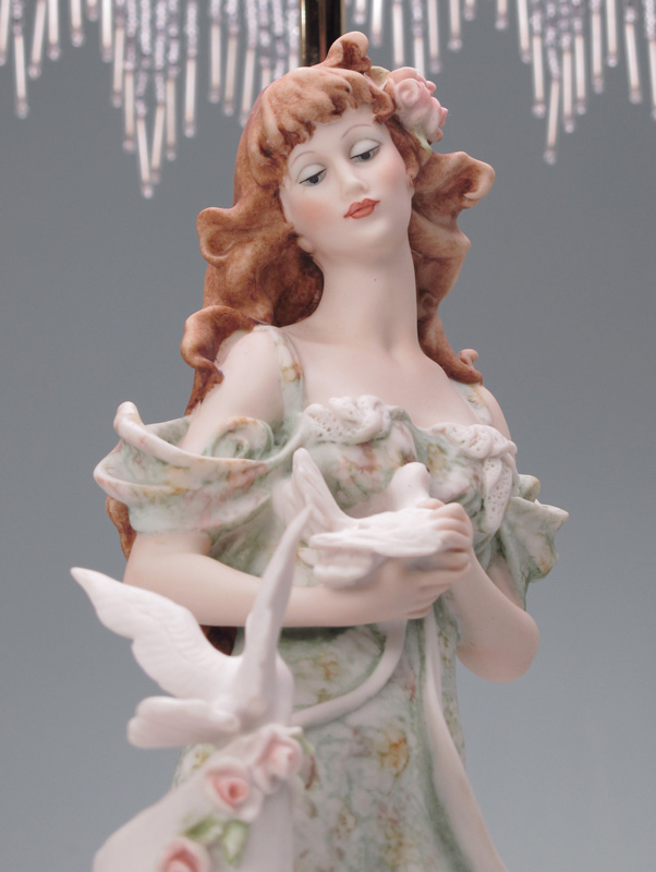 GIUSEPPE ARMANI FIGURAL LAMP: Redheaded Lady with Doves, 1987, signed to body of figurine, mounted as lamp with bead fringed shade. Figure 12''h., lamp overall 26''h., shade 14''dia.