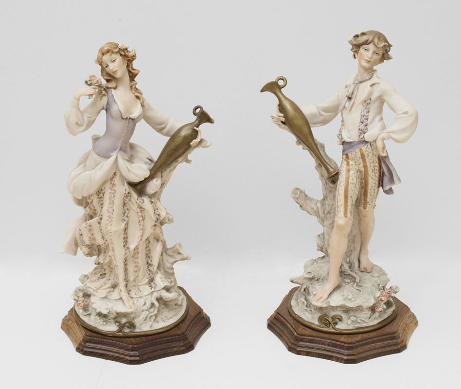 GIUSEPPE ARMANI FIGURAL COUPLE: Pair of 1986 figurines, each holding a matching ewer, dressed in complementary clothing. Mounted on shaped wooden plinths, overall 14''h.