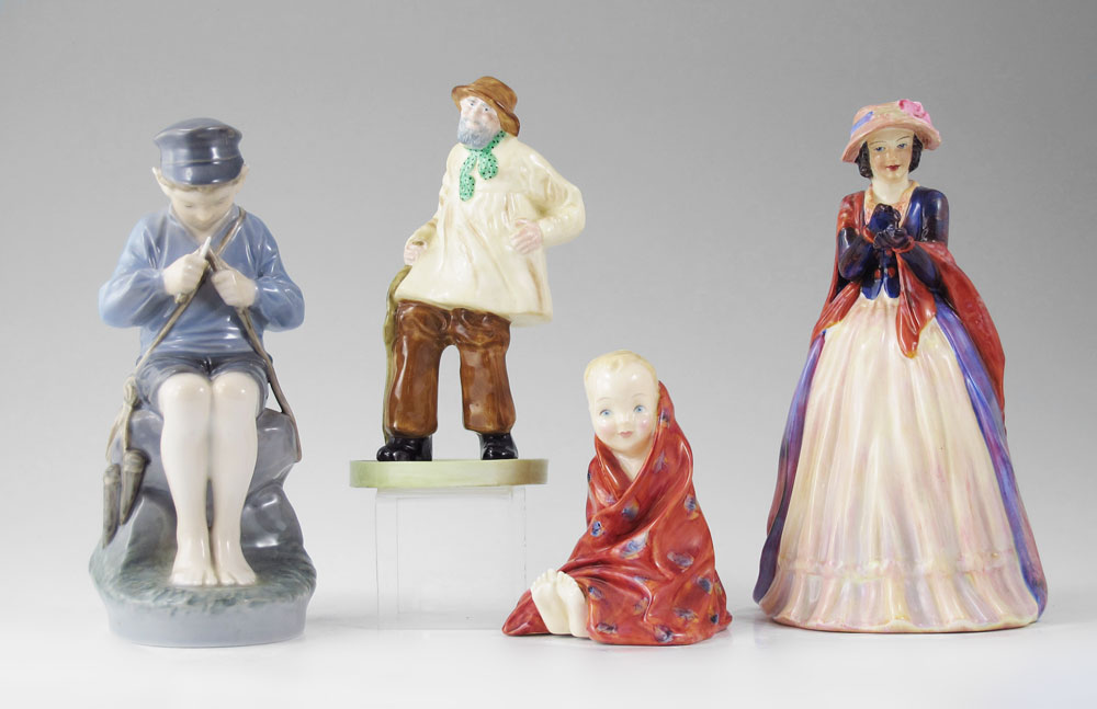 ESTATE LOT OF 4 PORCELAIN FIGURINES: To include, Royal Copenhagen BOY CARVING, #905, 7 3/8''; Royal Doulton THIS LITTLE PIG, #HN 1793; Paragon PATRICIA, #7, factory flaw missing fingers on right hand under paint and glaze, 7 1/2''; and Crown Staffordshire Old Man with Cane, marked #11?, horizontal hairline half way down back, 6 3/8''. Sold as a lot.