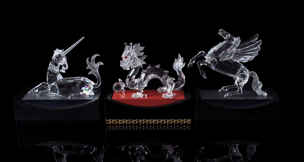 SWAROVSKI CRYSTAL SCS ANNUAL EDITION FABULOUS CREATURES: 1996 THE UNICORN, 191 727 / D01X961, Martin Zendron; 1997 DRAGON, 208 398 / D01X971, Gabriele Stamey; 1998 PEGASUS, 216 327 / D01X981 / 7400 098 000, Adi Stocker. All with a stand, a box and a certificate.