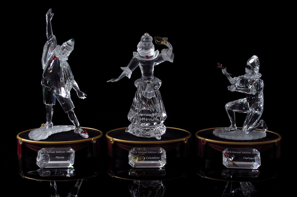 SWAROVSKI CRYSTAL SCS ANNUAL EDITION MASQUERADE: 1999 PIERROT, 230 586 / D01X991 / 7400 099 000, Adi Stocker; 2000 COLUMBINE, 242032 / D01X001 / 7400 200 000, Gabriele Stamey; 2001 HARLEQUIN, 254 044 / 7400 200 100, Anton Hirzinger. Each with a stand, a plaque, a box and a certificate.