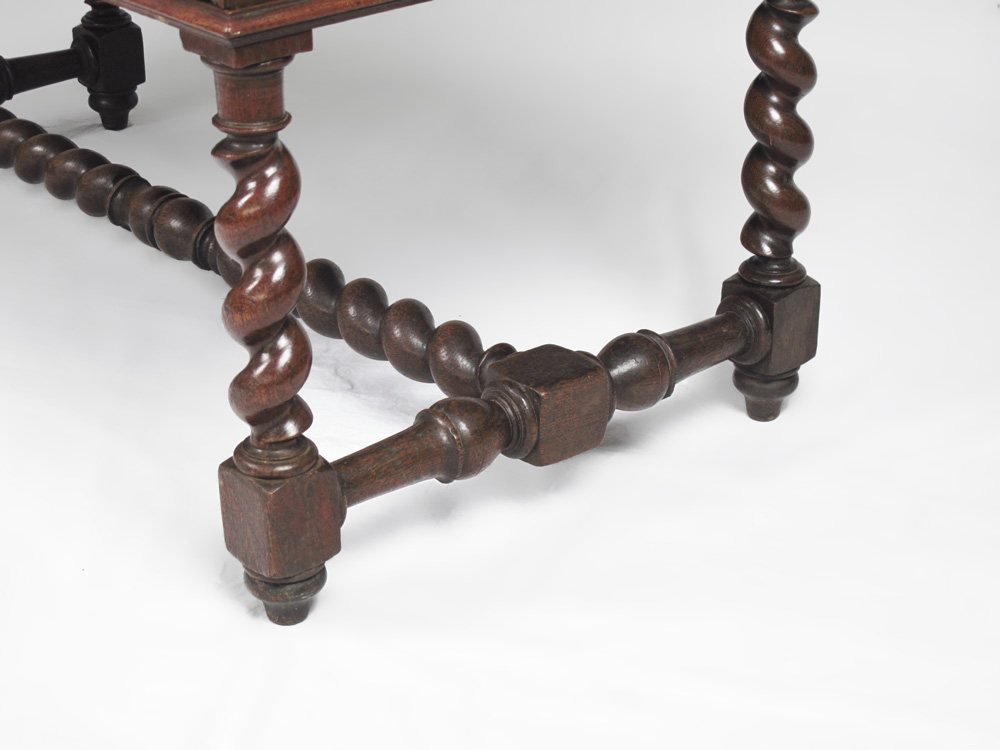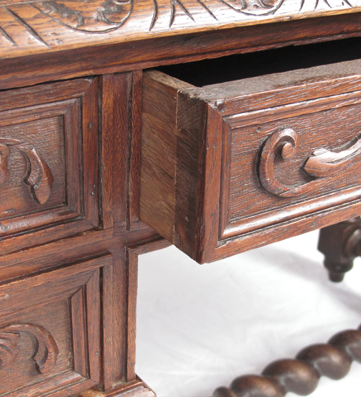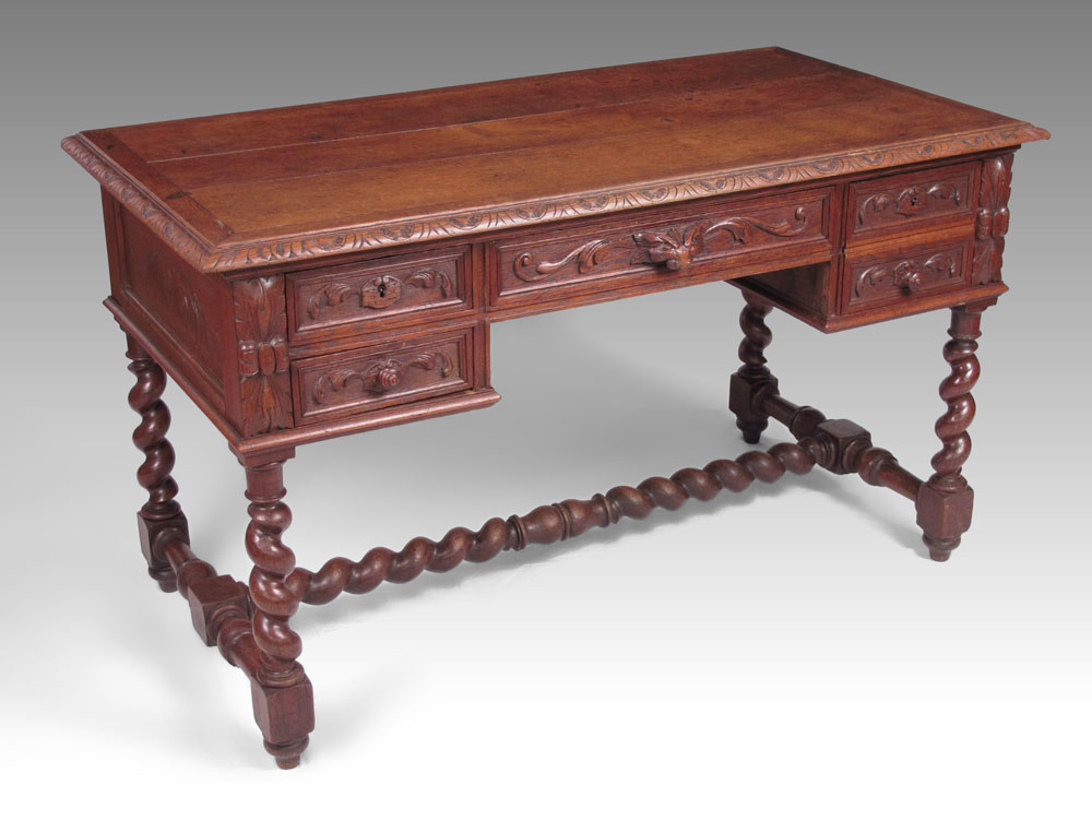 19th C BELGIAN OR FRENCH OAK WRITING TABLE: Continental 5 drawer writing table, barley twist legs and stretcher. French shipping labels.
