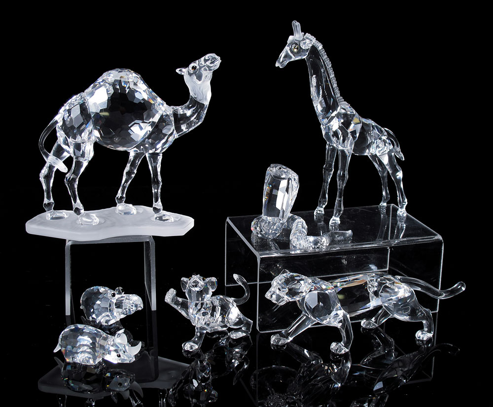SWAROVSKI CRYSTAL 7 AFRICAN WILDLIFE FIGURINES: LION CUB, 7306 000 001, Adi Stocker, 1997-2004; LEOPARD, 7610 000 002, Michael Stamey, 1997-2004; BABY GIRAFFE, 7603 000 002, Michael Stamey, 1999-2005; COBRA, 7603 000 003, Heinz Tabertshofer, 2000-2004; CAMEL, 7603 000 004, Heinz Tabertshofer, 2000-2004; SMALL HIPPOPOTAMUS, 7626 055 000, Adi Stocker, 1989-Dec 1995; SMALL RHINOCEROS, 7622 060 000, Adi Stocker, 1990-Dec 1995. All with box and certificate.