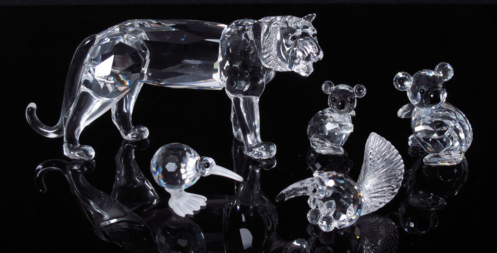 SWAROVSKI CRYSTAL 5 ENDANGERED SPECIES FIGURINES: KIWI, 7617 043 000, Michael Stamey, 1991-Dec 1996; KOALA BEAR VAR 2, 7673 040 000, Adi Stocker, 1987-2004; MINI KOALA VAR 1, 7673 030 000, Adi Stocker, 1989-Dec 2000; ANTEATER, 7680 000 001, Adi Stocker, 2001-2004; TIGER, 7610 000 003, Michael Stamey, 1998-Dec 2002. All with box and certificate.