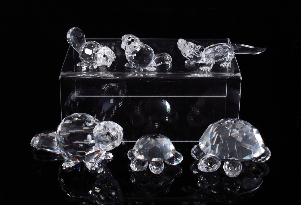 SWAROVSKI CRYSTAL 6 ENDANGERED SPECIES FIGURINES: MOTHER BEAVER, 7616 000 001, Adi Stocker, 1992-Dec 1996; SITTING BABY BEAVER, 7616 000 002, Adi Stocker, 1992-Dec 1999; LYING BABY BEAVER, 7616 000 003, Adi Stocker, 1992 - Dec 1995; LARGE TURTLE, 7632 045 000, Max Schreck, 1977-1998; SMALL TURTLE, 7632 030 000, Max Schreck, 1977-Dec 1996; ALLIGATOR, 7661 000 005, Michael Stamey, 1998-2004. All with box and certificate.