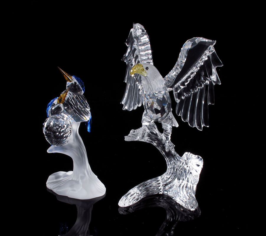 SWAROVSKI CRYSTAL FEATHERED BEAUTIES FIGURINES: MALACHITE KINGFISHERS, 7621 000 010, Adi Stocker, 2003-; BALD EAGLE, 7670 000 002, Adi Stocker, 2000-2008. Both with a box, Kingfishers with certificate.