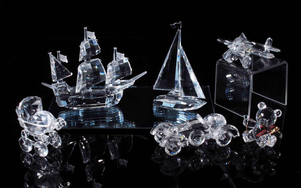 SWAROVSKI CRYSTAL 6 WHEN WE WERE YOUNG FIGURINES: BABY CARRIAGE, 7437 000 005, Gabriele Stamey, 1996-Dec 1999; CELEBRATION KRIS BEAR, 7637 000 005, Martin Zendron, 1999-2004; AIRPLANE, 7473 000 002, Adi Stocker, 1990-Dec 1999; OLD TIMER AUTOMOBILE, 7473 000 001, Gabriele Stamey, 1989-Dec 1995; SAILBOAT, 7473 000 004, Gabriele Stamey, 1994-2004; SANTA MARIA, 7473 000 003, Gabriele Stamey, 1991-2005. All with box and certificate.