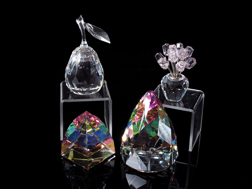 SWAROVSKI CRYSTAL PAPERWEIGHTS, ETC: IN THE SECRET GARDEN - DOZEN PINK ROSES, 7485 000 001/628 343, Gabriele Stamey, 2003-2008; SPARKLING FRUIT - PEAR, 7476 000 0002, Michael Stamey, 1991-Dec 1997; DECORATIVE ITEMS FOR THE DESK - PAPERWEIGHTS - VITRAIL MEDIUM SMALL PYRAMID, 7450 040 087 / 013 596, Max Schreck, 1986-Dec 1997, bad foam; DECORATIVE ITEMS FOR THE DESK - PAPERWEIGHTS - VITRAIL MEDIUM CONE / RIO, 7452 060 000 (087), Max Schreck, 1976-Dec 1992. All with box and certificate.