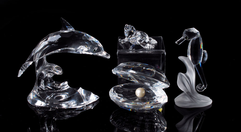 SWAROVSKI CRYSTAL 4 AQUATIC WORLDS: SHELL WITH PEARL, 7624 055 000, Michael Stamey, 1988-; DOLPHIN, 7644 000 001, Michael Stamey, 1995-; SEA HORSE, 7614 080 000, Michael Stamey, 1993-2006; BABY SEA LION, 7661 000 004, Michael Stamey, 1998-2010. All with box and certificate.