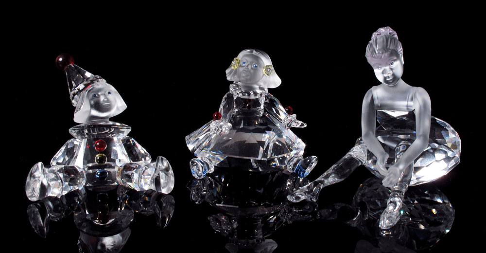 SWAROVSKI CRYSTAL 3 CHEERFUL TIMES FIGURINES: DOLL (PUPPE), 7550 000 012, Gabriele Stamey, 2003-2008; PUPPET, 7550 000 003, Gabriele Stamey, 1997-2008; YOUNG BALLERINA, 7550 000 007, Edith Mair, 2000-2009. All with box and certificate.