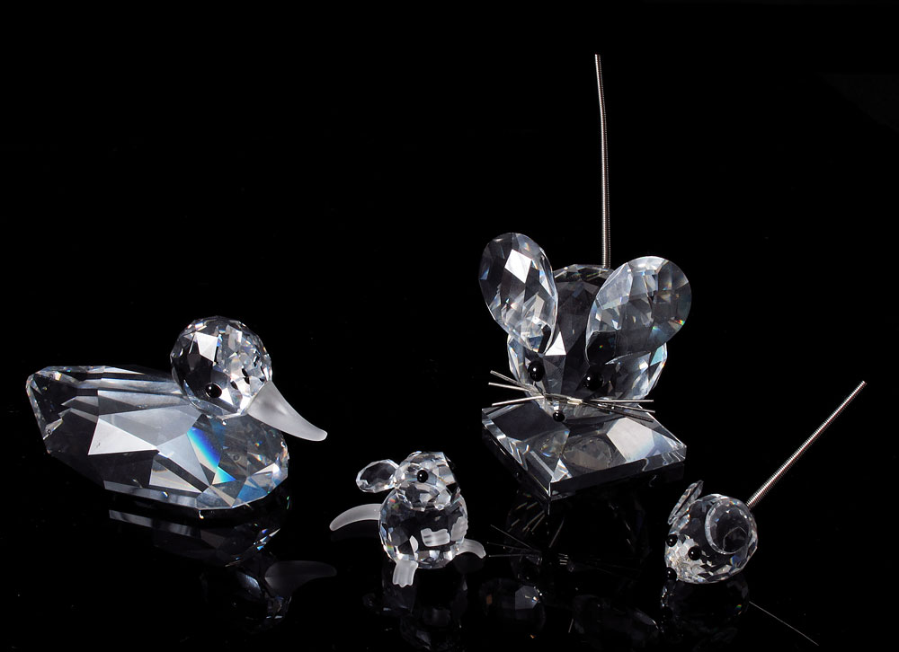 SWAROVSKI CRYSTAL FIGURINES: SILVER CRYSTAL - MINI MOUSE, 7655 023 000, Max Schreck, 1979-Dec 1988; IN A SUMMER MEADOW - FIELD MOUSE, 7631 025 000, Adi Stocker, 1991-Dec 2002; IN A SUMMER MEADOW - MEDIUM MOUSE VAR 2, 7631 040 000 / 010 025, Max Schreck, 1976-Dec 1995; BEAUTIES OF THE LAKE - MALLARD, 7647 080 000, Max Schreck, 1986-Dec 1994, bad foam. All with box and certificate.