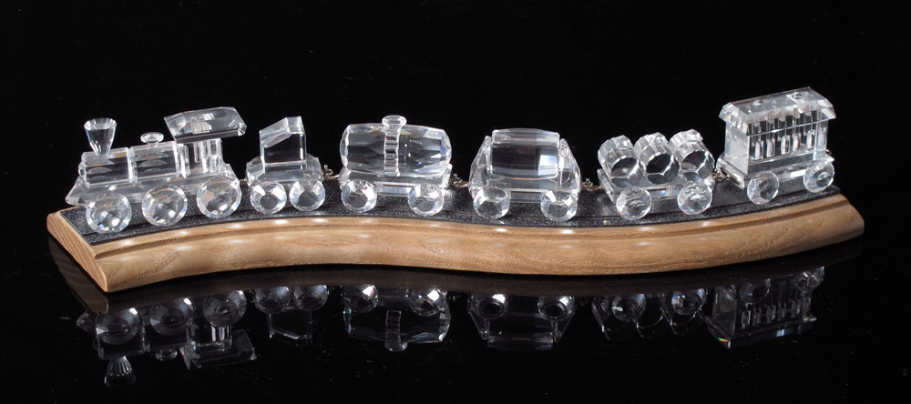 SWAROVSKI CRYSTAL TRAIN SET 7 PC: LOCOMOTIVE, 7471 000 001, Gabriele Stamey, 1988-2003; TENDER CAR, 7471 000 002, Gabriele Stamey, 1988-2003; WAGON (CARRIAGE) VAR. 2, 7471 000 003, Gabriele Stamey, 1988-2003; PETROL WAGON, 7471 000 004, Gabriele Stamey, 1990-Dec 2002; TIPPING WAGON, 7471 000 005, Gabriele Stamey, 1993-2003; TANK WAGON, 7471 000 006, Gabriele Stamey, 1998-2003; WOODEN TRACK DISPLAY, 7750 000 202. All with box and certificate.