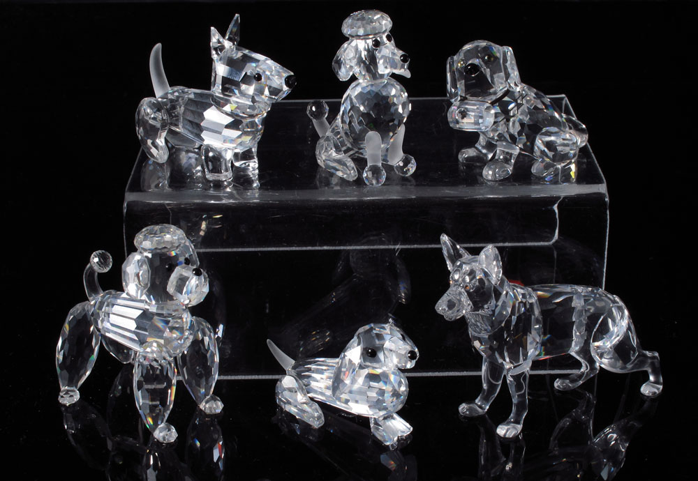 SWAROVSKI CRYSTAL 6 PETS' CORNER FIGURINES: SITTING POODLE, 7619 000 005, Adi Stocker, 1994-2004; (SCOTCH) TERRIER, 7619 000 002, Adi Stocker, 1990-Dec 1996; ST. BERNARD, 7619 000 006, Edith Mair, 1996-2004; STANDING POODLE WITH CLEAR TAIL, 7619 000 003, Adi Stocker, 1992-Dec 1997; GERMAN SHEPHERD, 7619 000 007, Heinz Tabertshofer, 1999-2004; MINI DACHSHUND, 7672 042 000, Adi Stocker, 1987-Dec 1995. All with box and 4 with certificate.