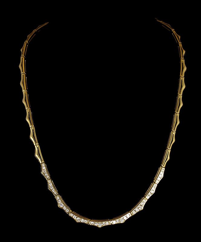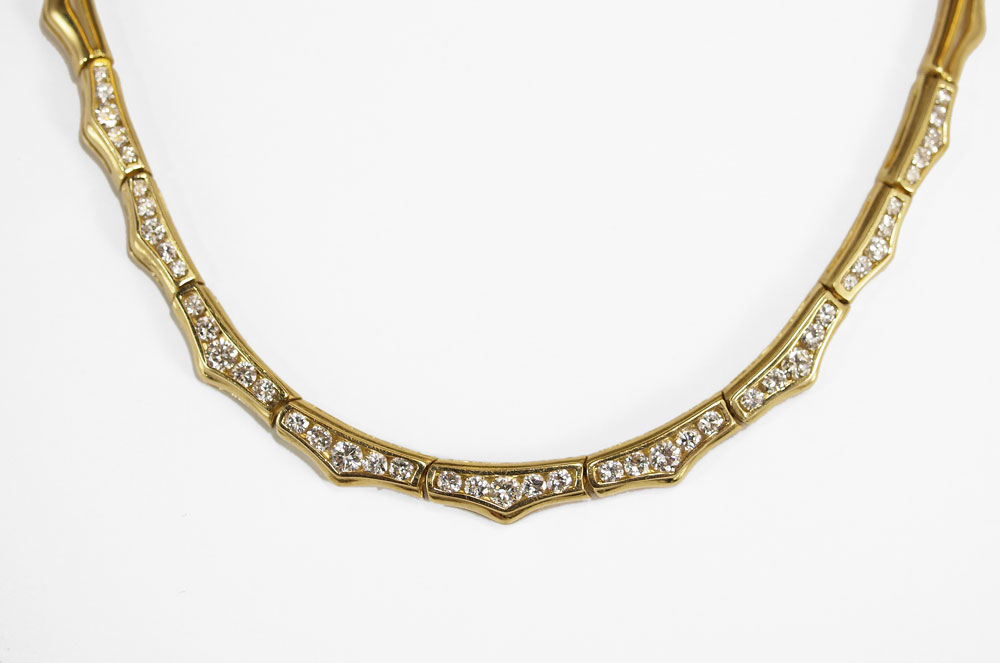 18K GOLD AND DIAMOND WAVE NECKLACE: 18K yellow gold necklace of 45 round brilliant cut channel set diamonds, all totaling approx. 3.00 Ct. The diamonds average VS in clarity and G-H color. Locking closure with figure 8 clasp. European hallmarks. Weight: 40.1 grams. Sold with current Florida Diamond Appraisers GIA graduates appraisal for $11,250.