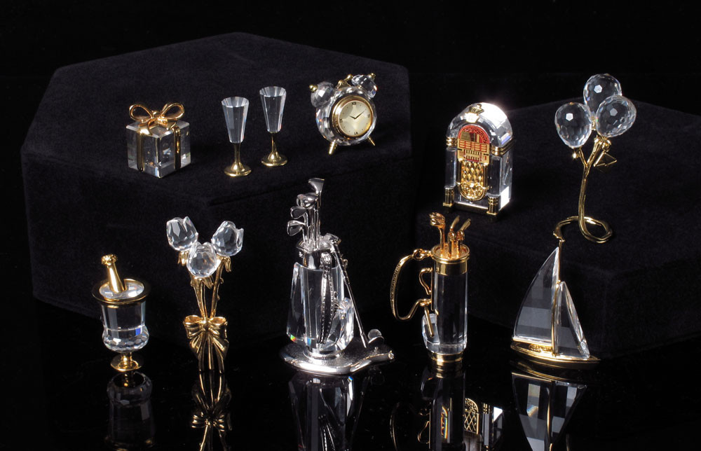 SWAROVSKI CRYSTAL MEMORIES / CRYSTAL MOMENTS PIECES: CELEBRATIONS - BALLONS, 9460 000 067, Anton Hirzinger, 1995-2004; SPORTS AND TROPHIES - GOLF TROPHY, 9460 000 166, Heinz Tabertshofer, 2004-2007; TIMES PAST - ALARM CLOCK, 9460 000 080, team, 1998-2002; CELEBRATIONS - BOUQUET, 9460 000 072, Gabriele Stamey, 1996-2004; SPARKLING WINE COOLER & FLUTES (NO CLOTH), 9460 000 065, Anton Poppinger; IN A CLASS OF THEIR OWN - SAILBOAT, 9460 000 050, Anton Hirzinger/Anton Poppinger1994-2001; TIMES PAST - JUKE BOX, 9460 000 100, team, 2000-Jan 2003; CONGRATULATIONS - PRESENT, 9406 000 066, Edith Mair, 1995-2005; IN A CLASS OF THEIR OWN - GOLF BAG, 9460 000 018, Nicole Dupont, 1993-2002. All with boxes and most have certificate.