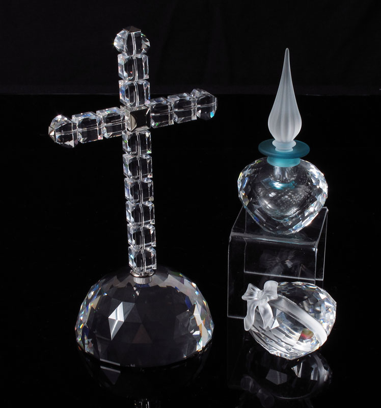 SWAROVSKI CRYSTAL EXQUISITE ACCENTS: EXQUISITE ACCENTS - ORIENTAL FLACON, 7402 000 001, Martin Zendron, 1997-Dec 2002; THE CROSS OF LIGHT, 7512 000 001, Stefano Ricci, 2001-2004; EXQUISITE ACCENTS- SWEET HEART, 7480 000 001, Edith Mair, 1997-2004. All with box but only one certificate.