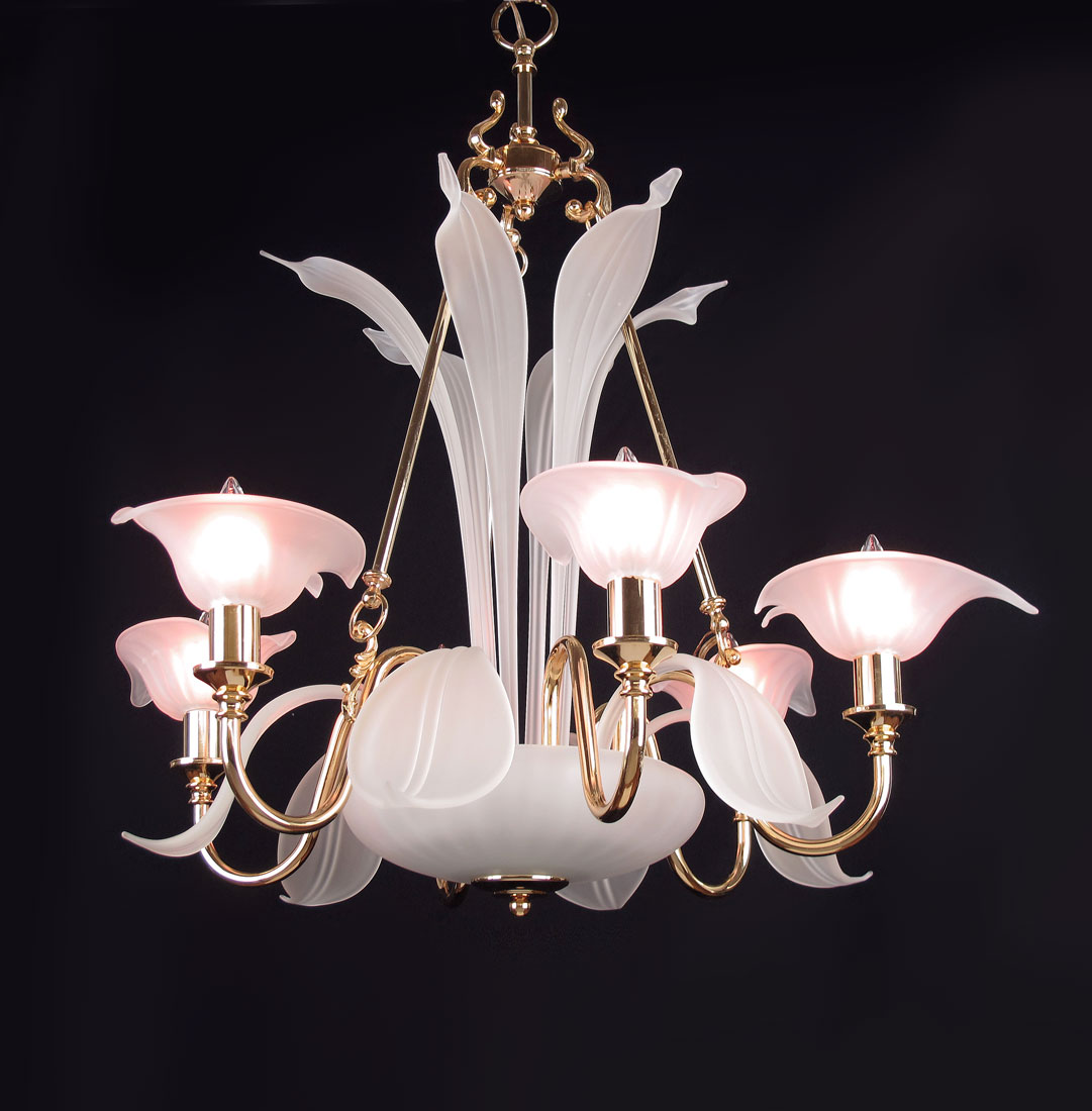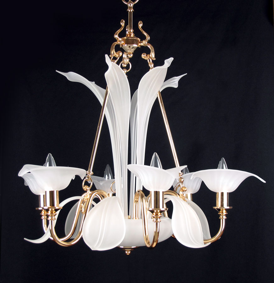 ART NOUVEAU STYLE FROSTED GLASS & BRASS CHANDELIER: 6 light electric chandelier with leaf form frosted glass shades and leaf embellishments rising from the center. Unmarked. Measures approx. 30'' h. x 28 3/4'' dia.
