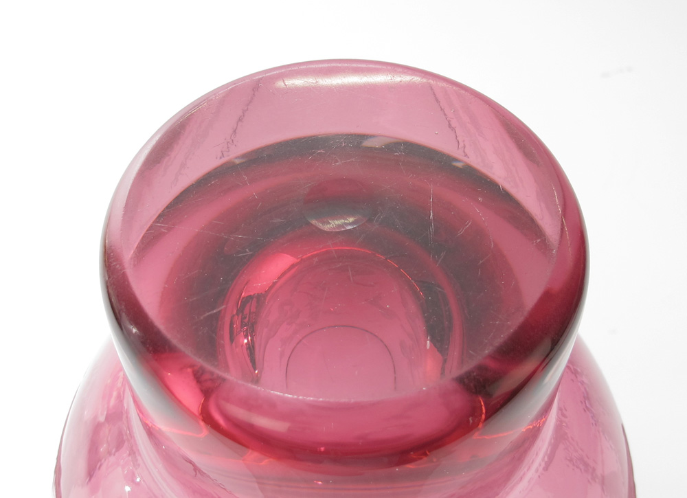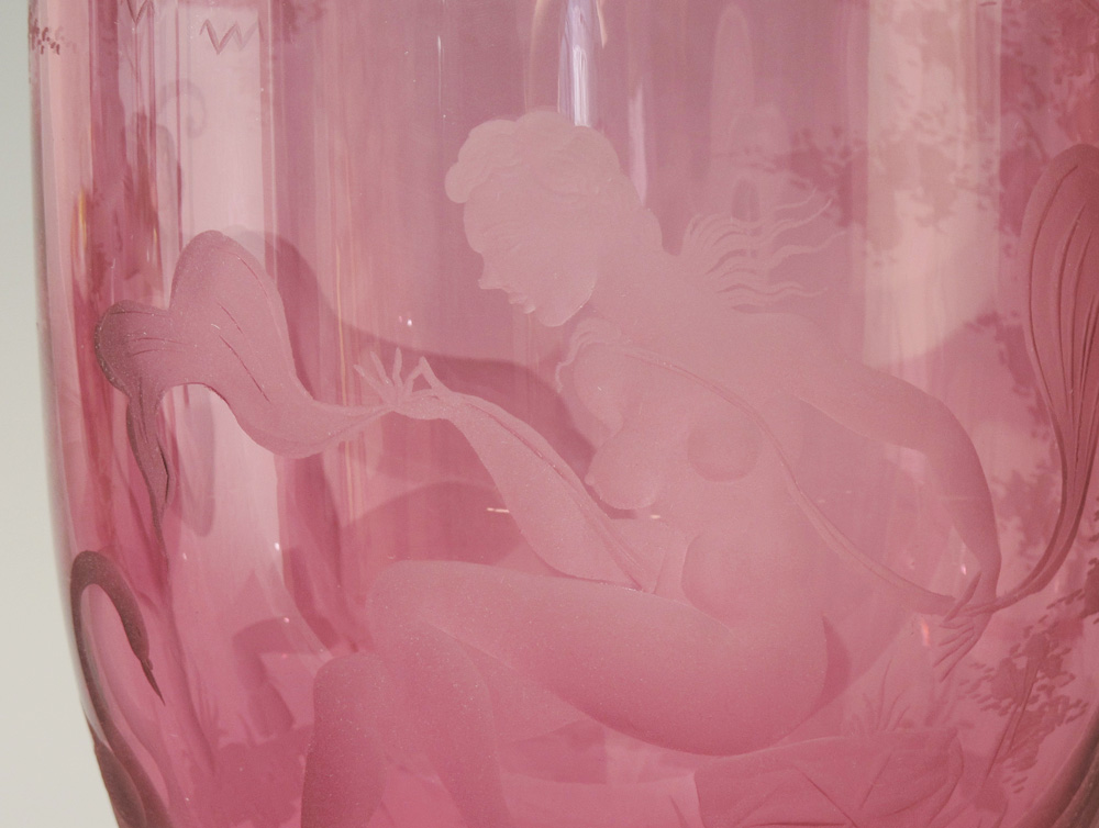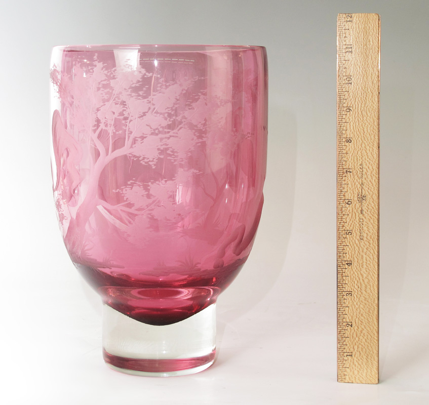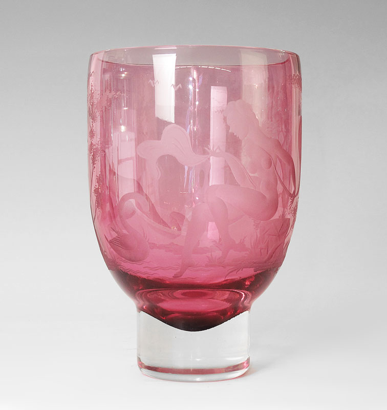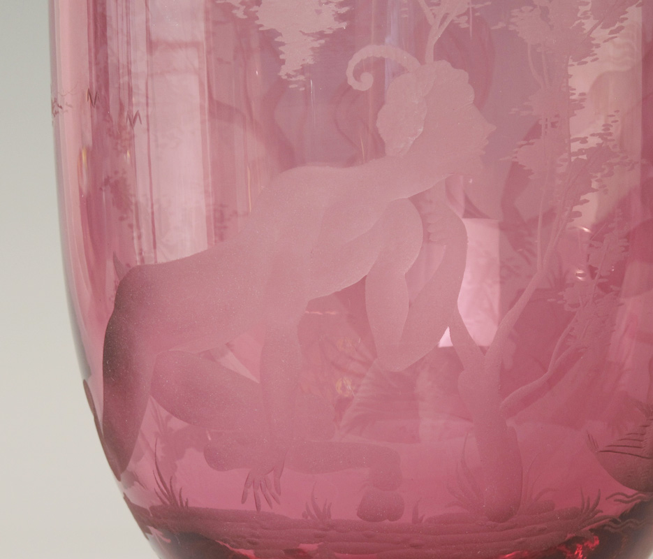 ART DECO ENGRAVED CRANBERRY GLASS VASE: Intaglio cut with satyr, swan and nude maiden motif, unmarked, clear glass base. 11'' h. x 7 1/2'' dia.