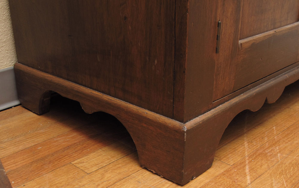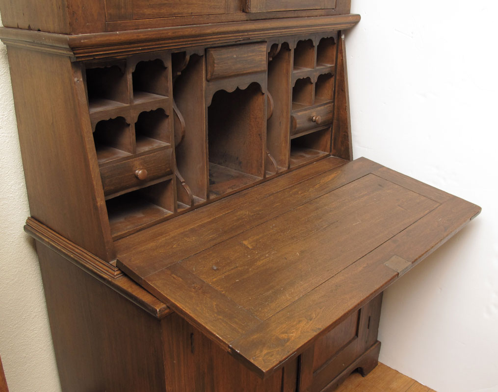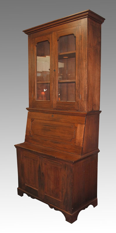 19TH CENTURY COUNTRY SECRETARY BOOKCASE: Top section with 2 glass doors and 2 shelves over base with fall front desk, opens to 3 drawers and pigeon holes. 91'' h. x 40'' x 21 3/4''.