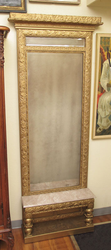 CARVED GILT WOOD VICTORIAN ERA PIER MIRROR: Carved gilt wood frame with floral and foliate motif. Beveled glass mirror. Lower marble top shelf with carved supports. 91 1/2'' h. x 32 1/4'' x 10''.