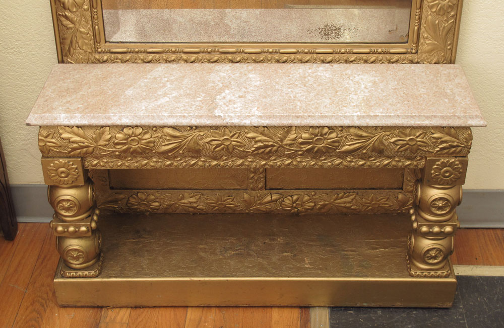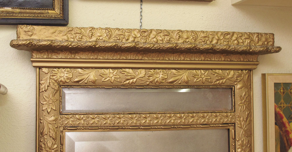 CONDITION: Note older repair and loss of carving to top of frame, spotting to mirror. Please call for condition.