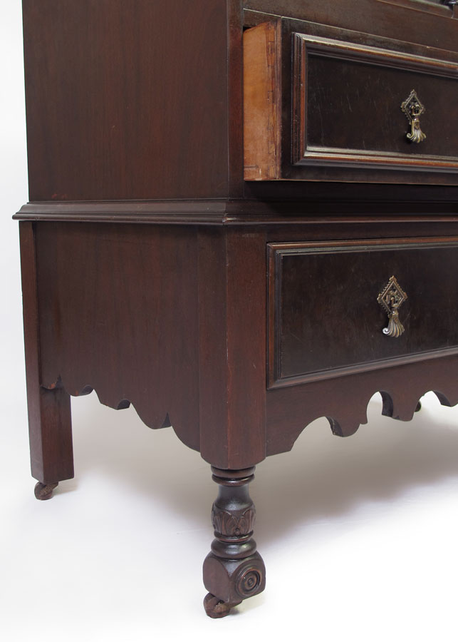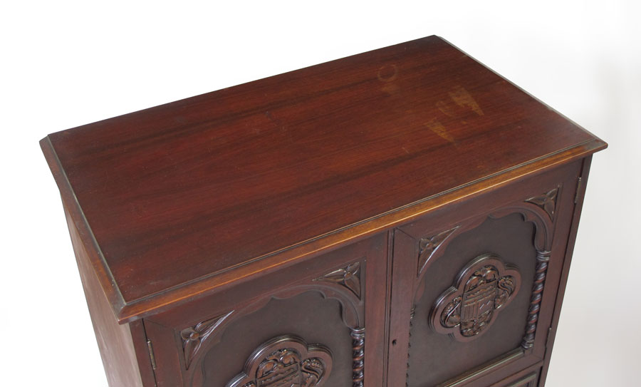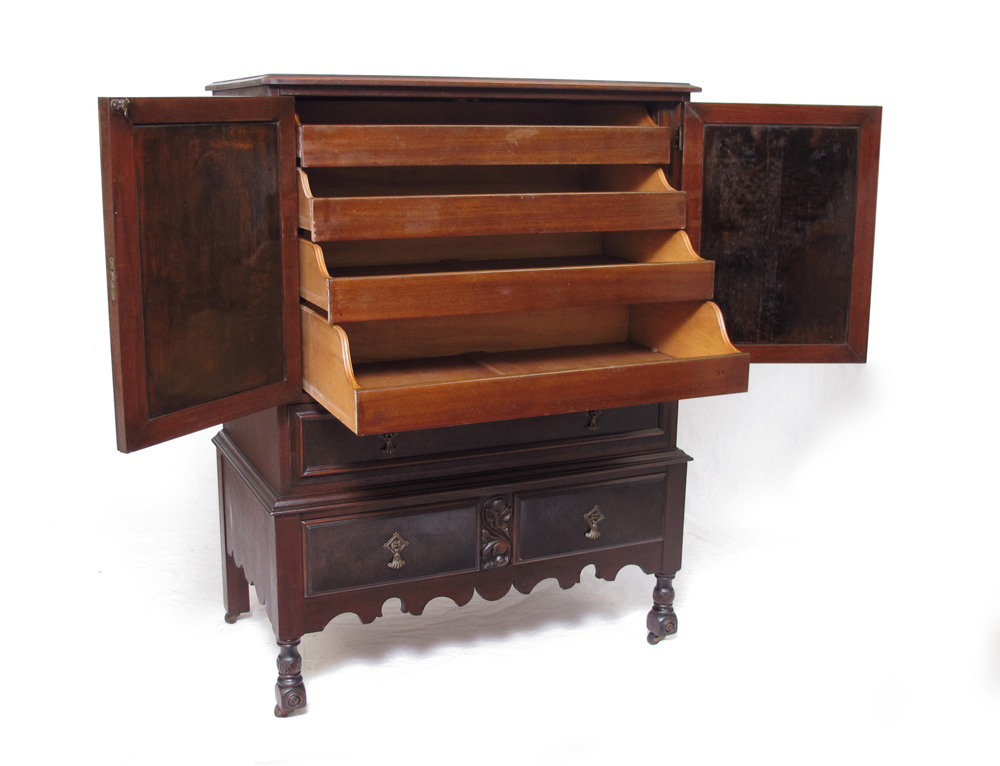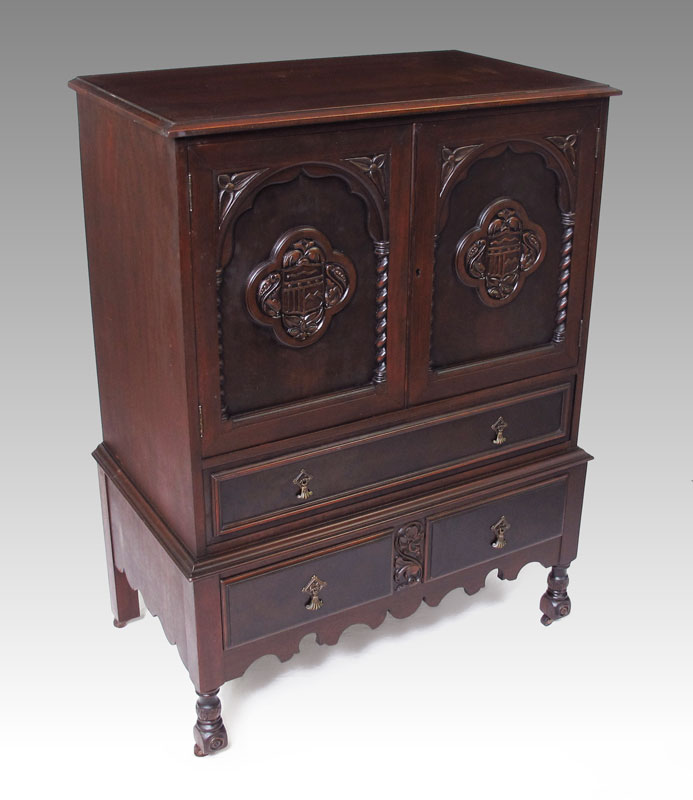 SLIGH FURNITURE CARVED GENTLEMAN'S CHEST: 2 door with carved and applied decoration over full length drawer. Base with 2 drawers, applied carved decoration, shaped skirt, carved front feet. 51 1/2'' h. x 38'' x 22''.