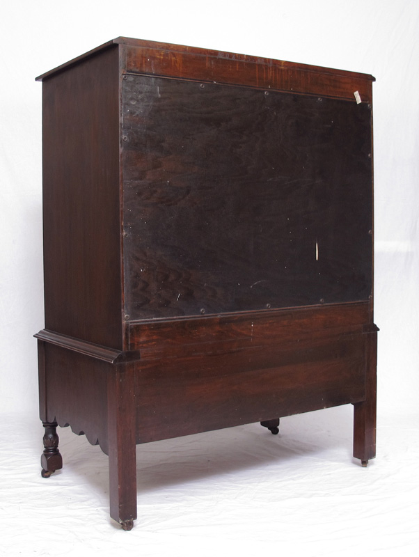 CONDITION: Uneven finish, especially on top, chips to veneer, other wear consistent with age and use.