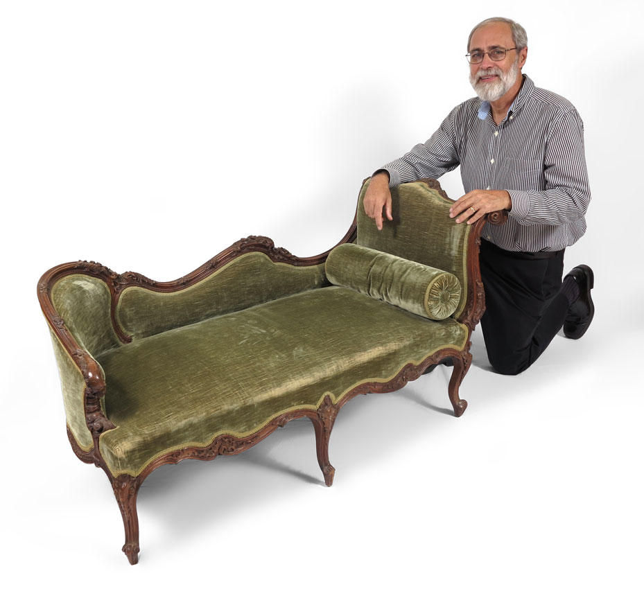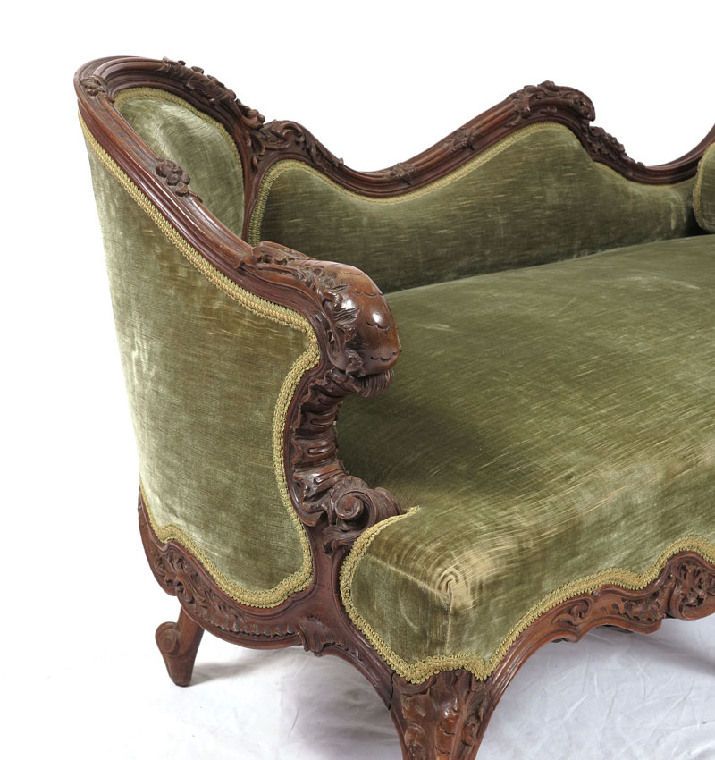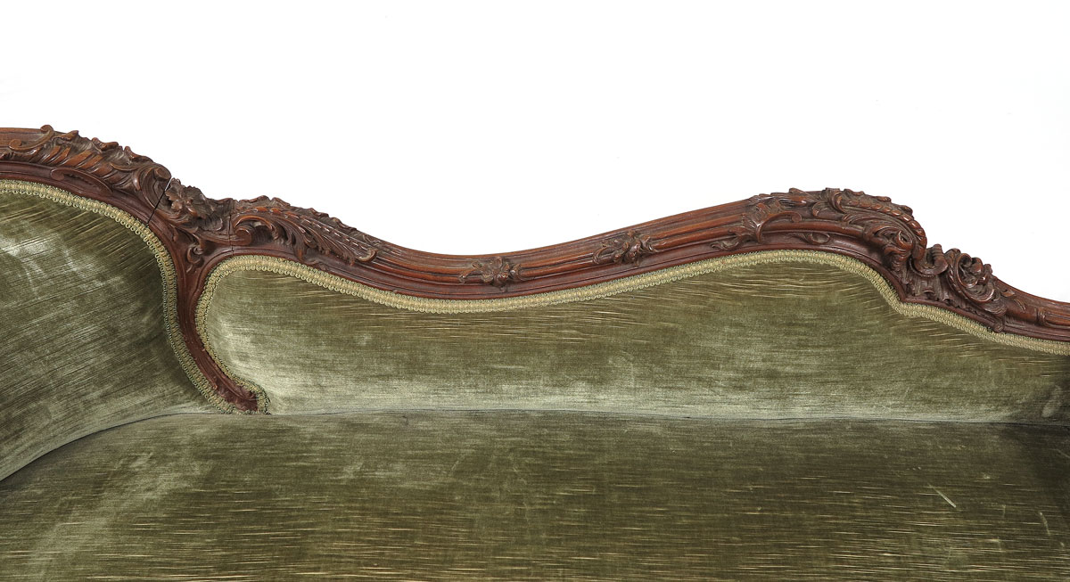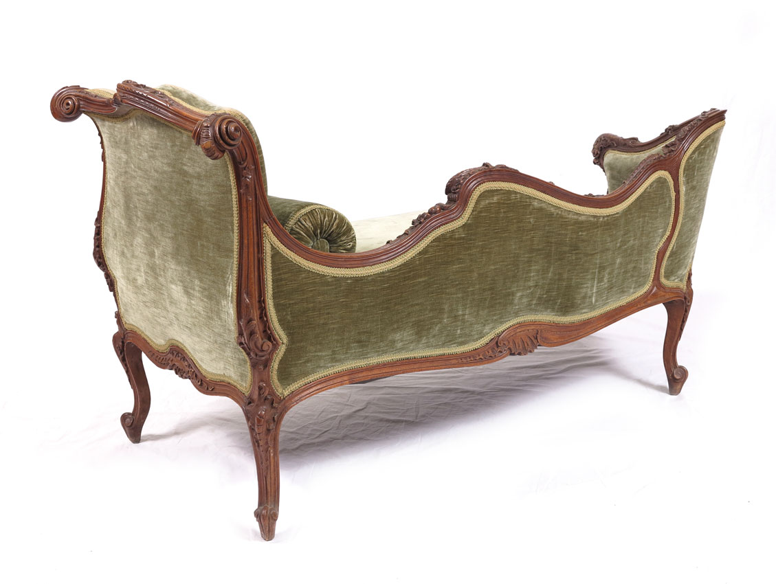 DIMINUTIVE CARVED FRENCH RECAMIER / DAYBED: Rocaille carved walnut frame, deep green upholstery. Measures approx. 29''h x 23'' x 55''l. Purchased from the estate auction of Bob Bugnand, and is said to have belonged to Greta Garbo.