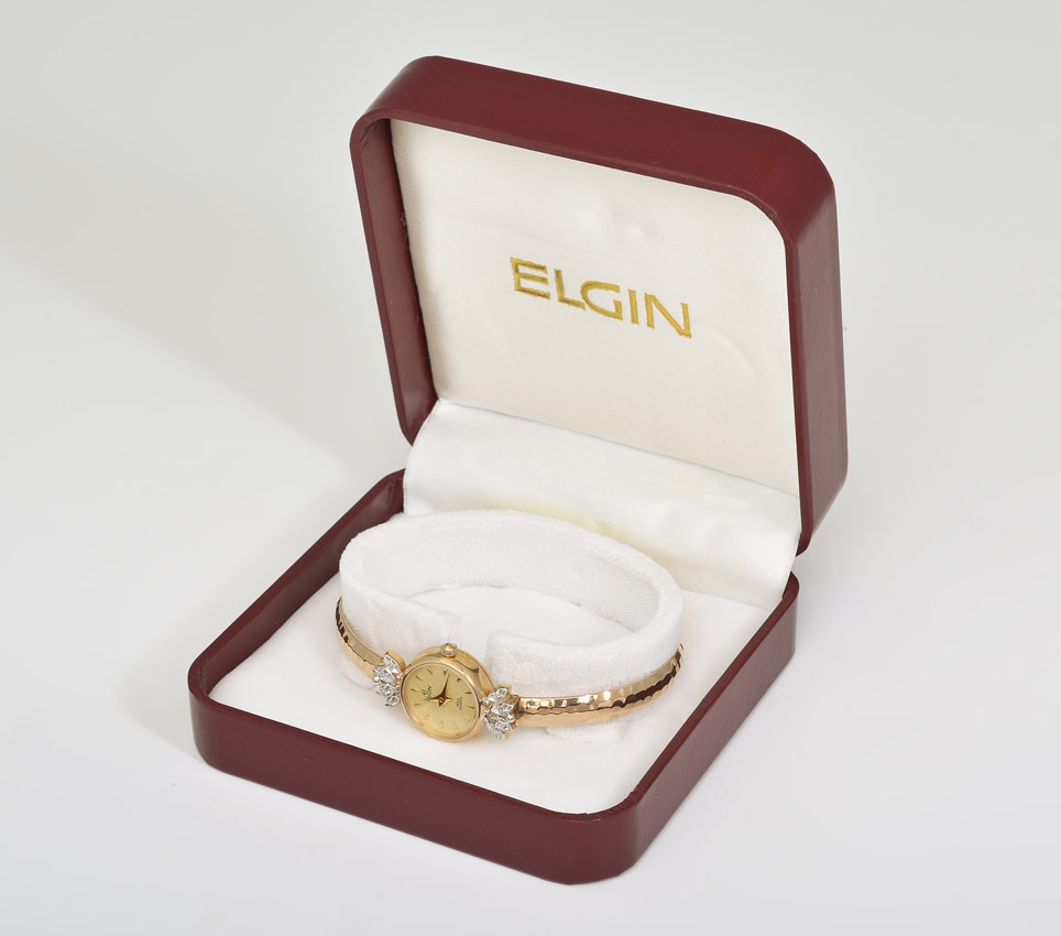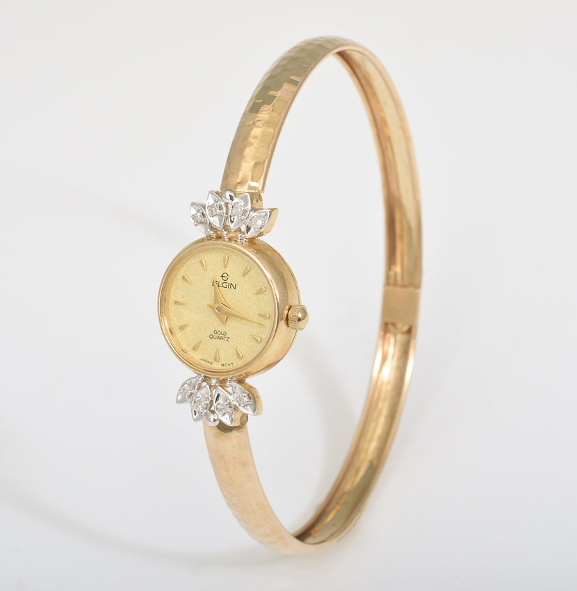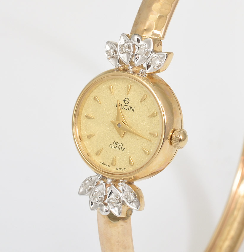 14K LADY'S ELGIN WRISTWATCH: 14K yellow gold lady's Elgin wristwatch. Hammered bangle bracelet. Round dial framed by 8 round single cut diamond. Weight: .10 Ct. Approx. Rated VS in clarity and G-H in color. Quartz movement. Weight: 11.0 grams. Diameter 2.5''