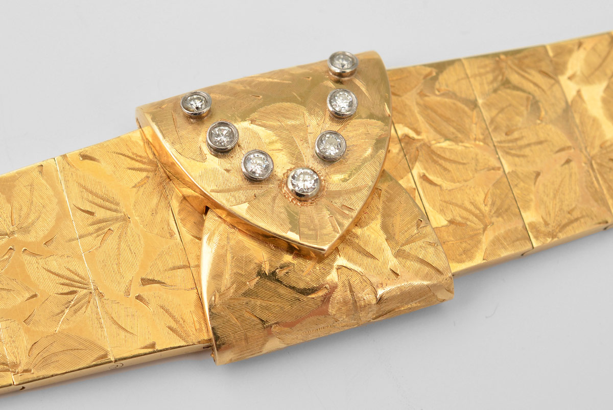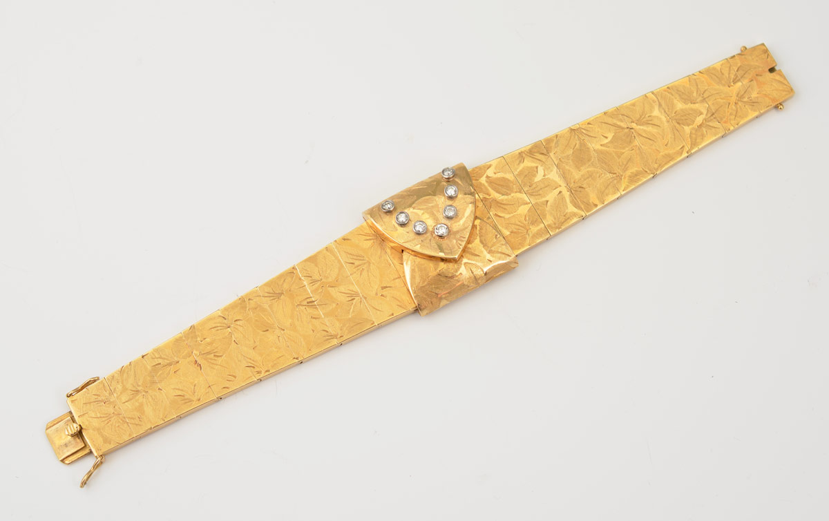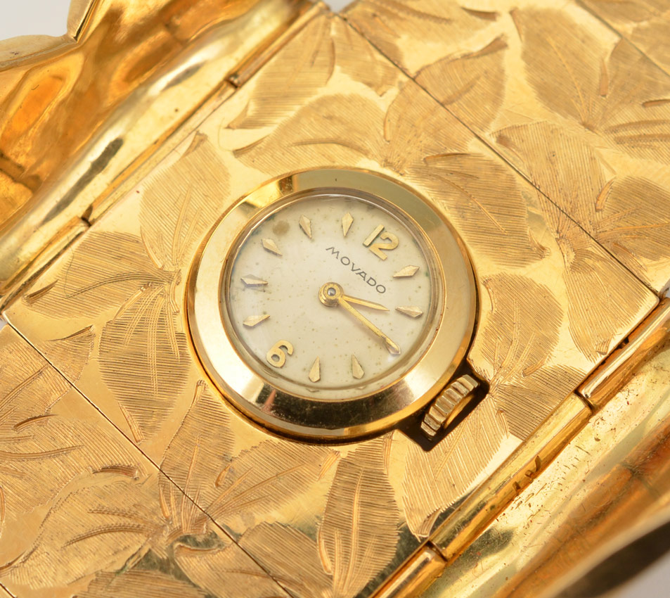 18K MOVADO COVERED BRACELET WRISTWATCH: 18K yellow gold lady's Movado wristwatch with a wide tapered link bracelet and case in a Florentine leaf pattern. The round dial is 11.00 mm, with acrylic crystal. Hinged ''envelope'' style cover in two pieces with 7 round brilliant cut diamonds totaling approx. .33 Ct. averaging VS in clarity and G-H in color. The diamonds are bezel set. Mechanical movement in running order. Width: 1 1/16''. Length: 7.25''. Weight: 80.9 grams.