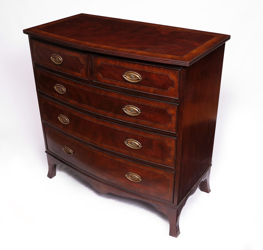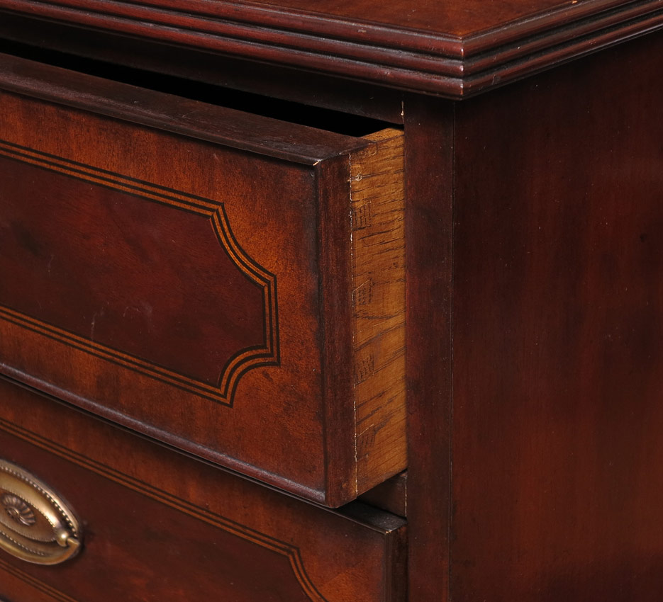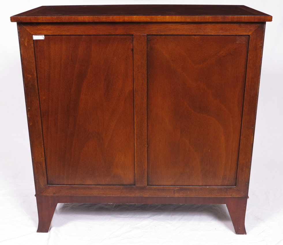 BANDED MAHOGANY 3 DRAWER CHEST: Banded inlay on top and drawers, 2 half drawers over 3 graduated full drawers. Brass pulls. Shaped skirt with inlay center. 39 1/4'' x 39'' x 21''. Please see matching chest previous lot.