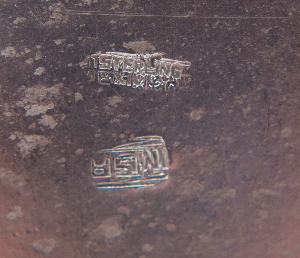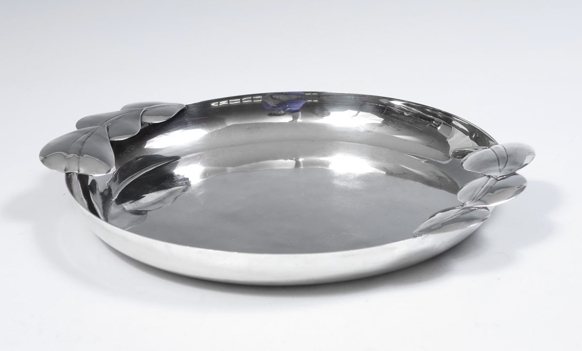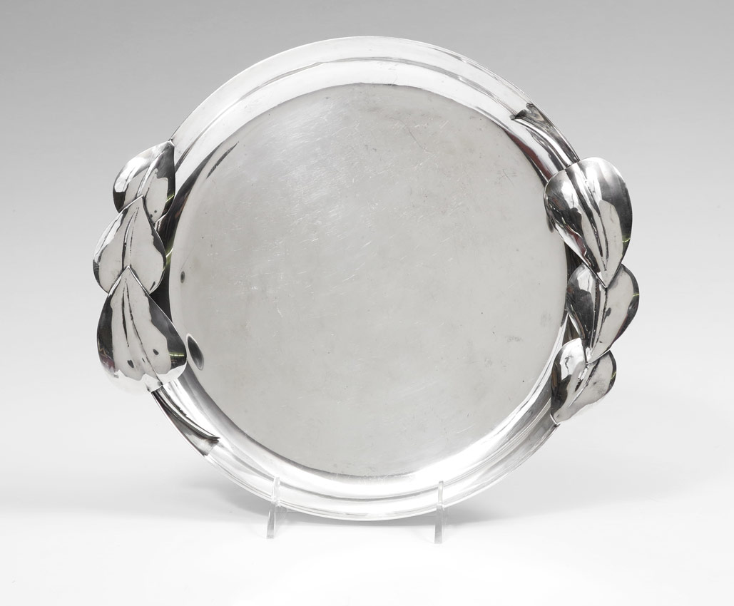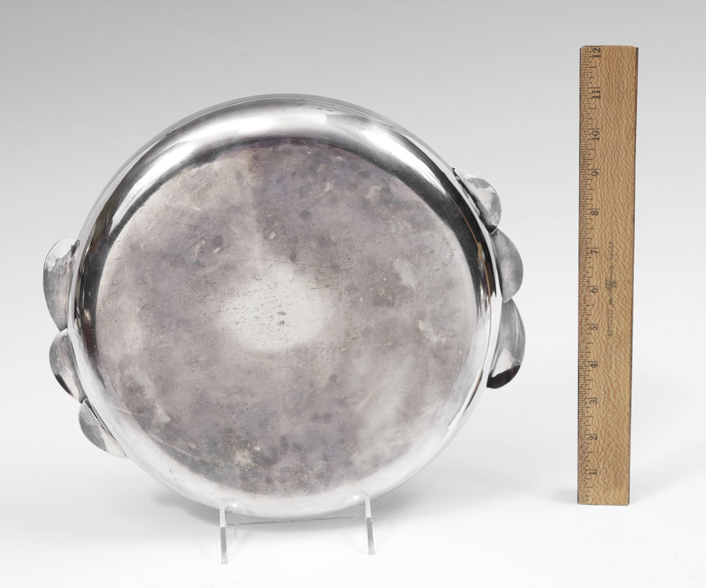 LARGE MEXICAN STERLING SERVING TRAY /PLATE: With applied leaf decoration on sides. Marked MRS Sterling Mexico. Measures 1 1/2'' h. x 12 1/4'' dia. Approx. 28.6 troy oz.