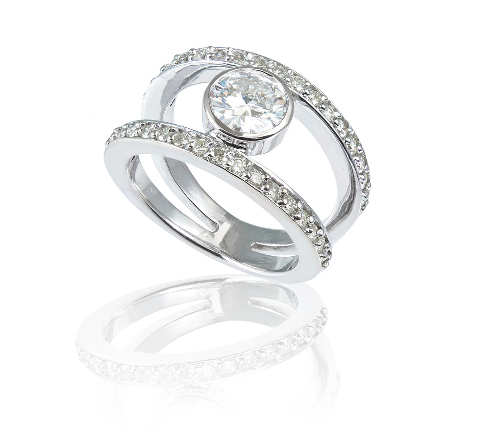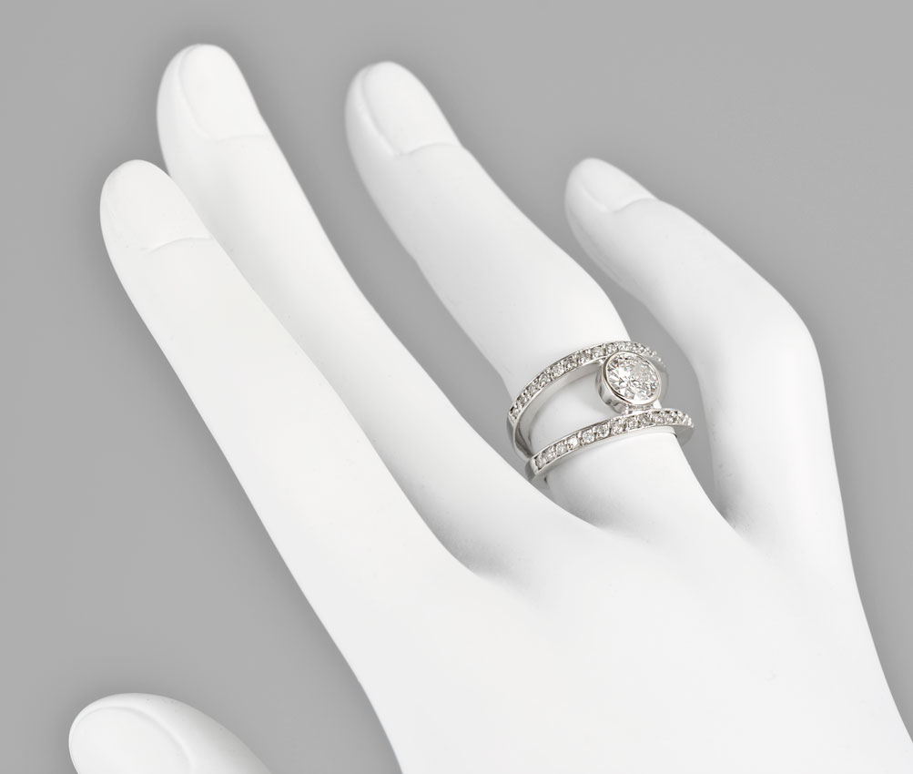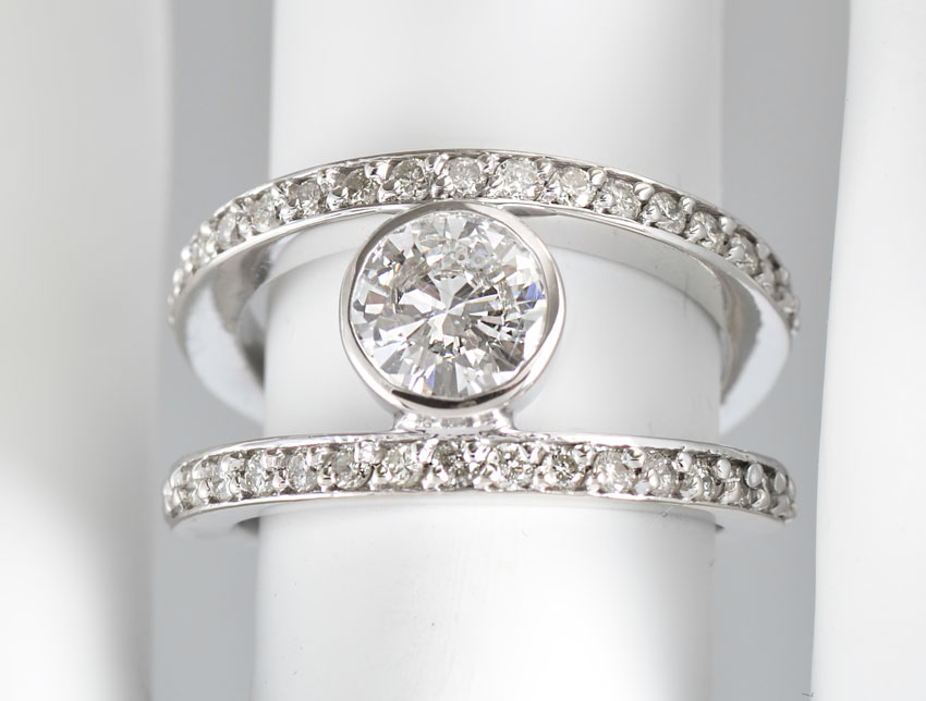 .78 CT DIAMOND BETWEEN 2 DIAMOND BANDS: 14K white gold ring suspends an approx .78 Ct round brilliant cut, bezel set diamond of SI2 in clarity and G color. The bands have 34 round brilliant cut diamonds totaling approx. .50 Ct., averaging SI in clarity and H-I-J color. Size 4. Weight 5.7 grams. Sold with current Florida Diamond Appraisers GIA graduates appraisal for $5,950.
