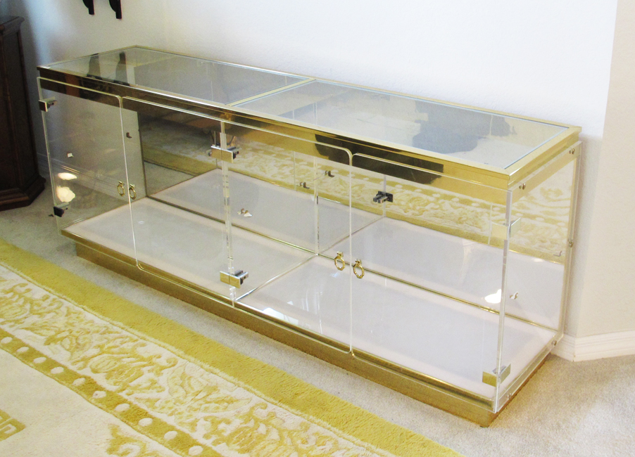 CHARLES HOLLIS JONES LUCITE & GLASS CREDENZA /CONSOLE: Glass top, 4 lucite front doors, glass shelves. Brass finish to frame. 29 1/4'' h. x 71 1/2'' x 17 1/2''.