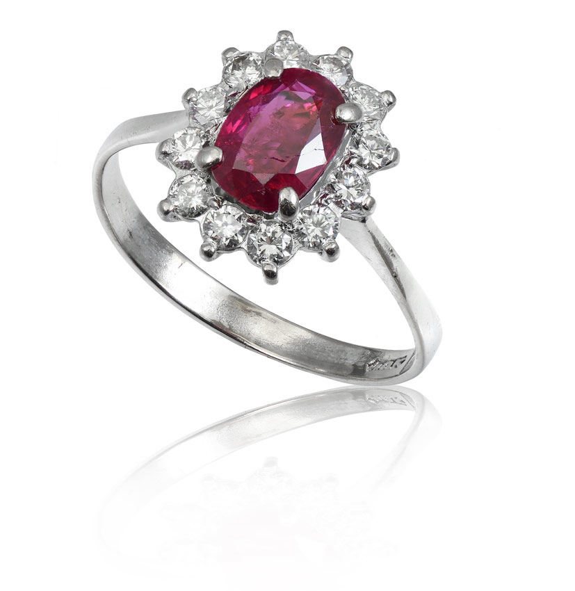 14K RUBY & DIAMOND RING: 14K white gold ring centers one oval shaped mixed cut ruby. Weight: 1.00 Ct. Approx. Rated SI in clarity (Type II) slpR in hue, 5-6 in Tone and 5 in Saturation. Framed by 12 round brilliant cut diamonds. Weight: .45 Ct. Approx. Rated VS-SI in clarity and G-H in color. The ruby and diamonds are prong set. Size 7.5. Weight: 2.5 grams.