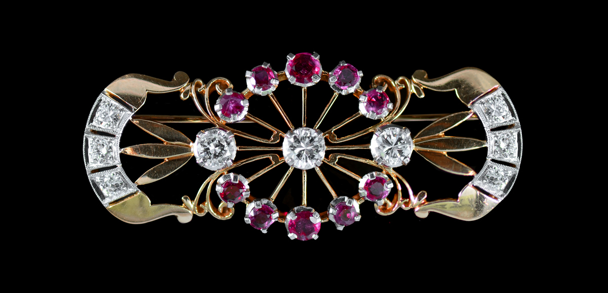 ART DECO DIAMOND AND RUBY BROOCH: 18K and 14K yellow gold brooch with 9 round brilliant diamonds totaling approx, 1 Ct, averaging VS in clarity and G-H color. The 10 round shaped mixed cut rubies total approx. 2 Ct. Bar pin closure. Length: 2''. Width 3/4''. Weight 8.9 grams. Sold with current Atlanta Gemological GIA graduates appraisal for $4,000.
