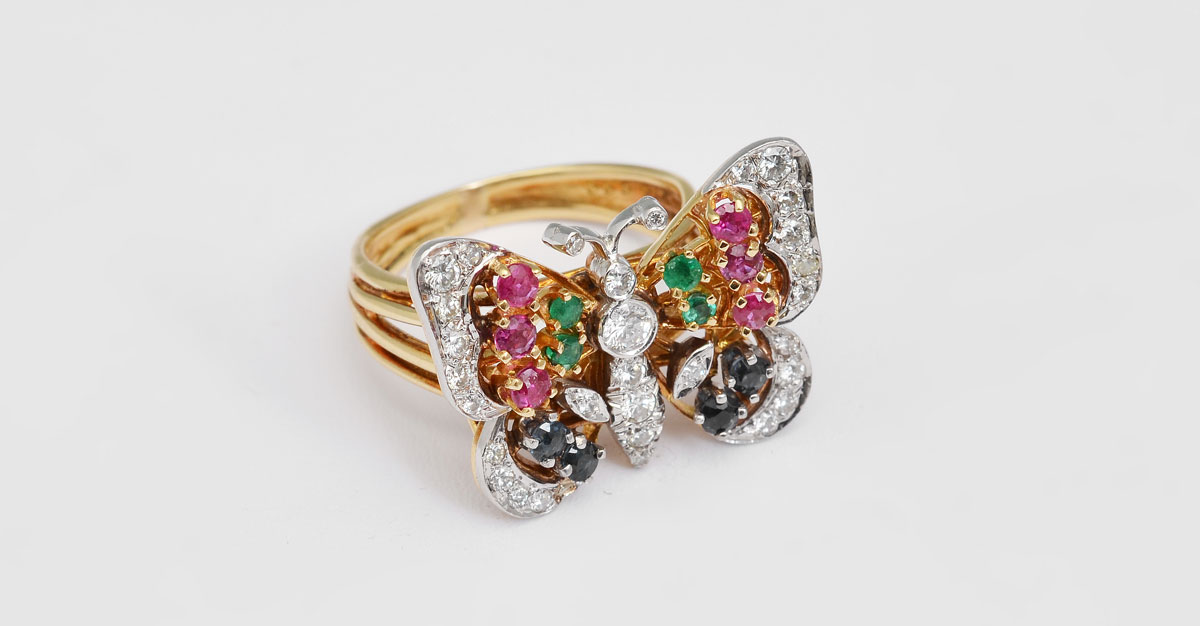 18K GEMSTONE BUTTERFLY RING: Whimsical 18K yellow gold ring contains 30 round brilliant and single cut diamonds totaling approx. .50 Ct., Rated VS in clarity and G-H in color. The 14 round mixed cut rubies, sapphires and emeralds total approx. .50 Ct. The diamonds and gemstones are prong set. Size 6.75. Weight: 8.7 grams.