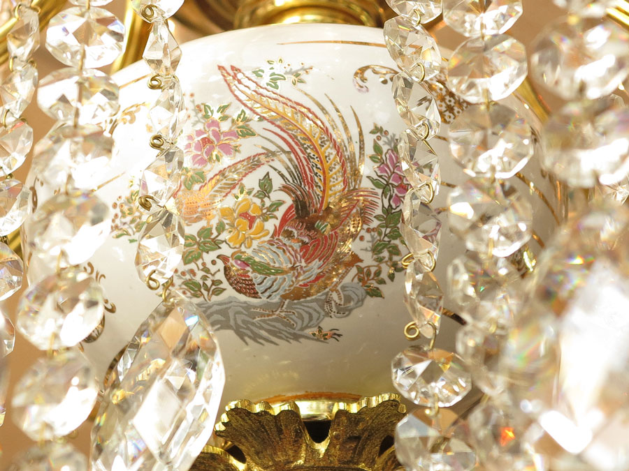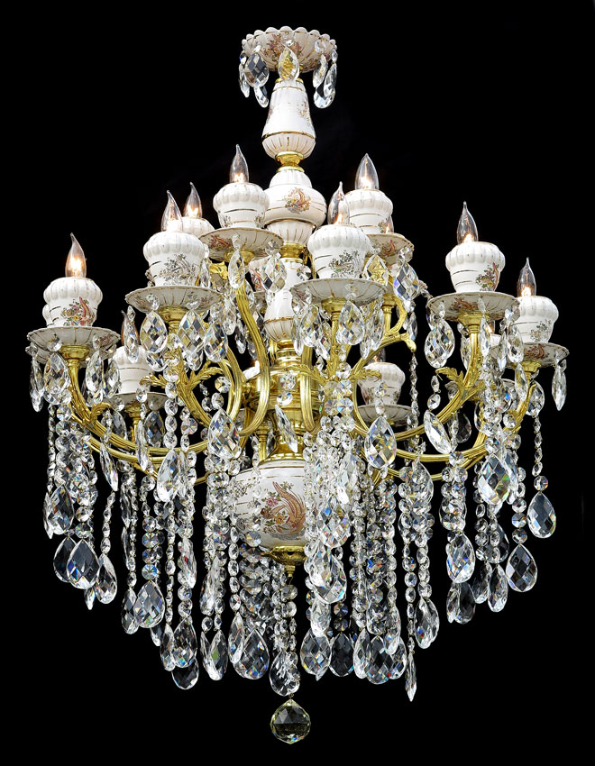 15 LIGHT BRASS, PORCELAIN, AND CRYSTAL CHANDELIER: The porcelain is hand painted in 24K gold. Dripping in faceted octagonal and tear shaped crystals. Made in Turkey. Measures approx. 36'' tall x 28'' dia., excluding the chain. Original ceiling collar in the office.