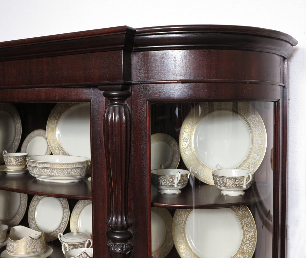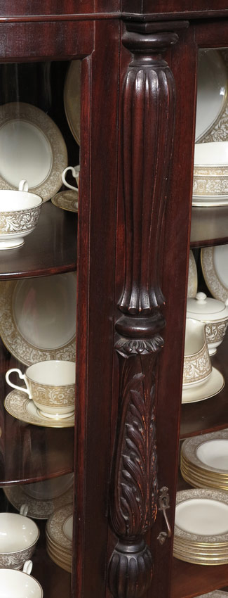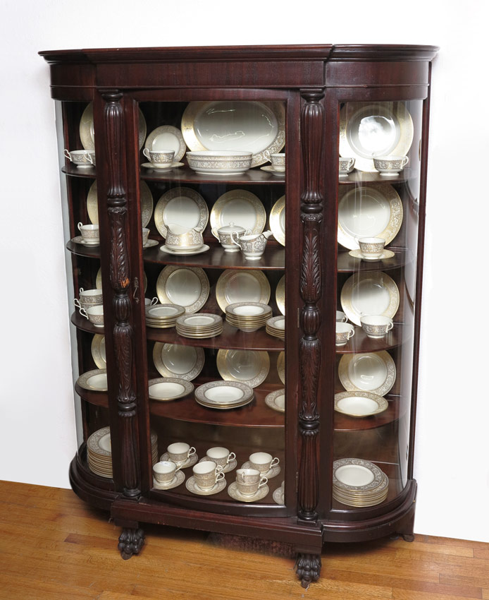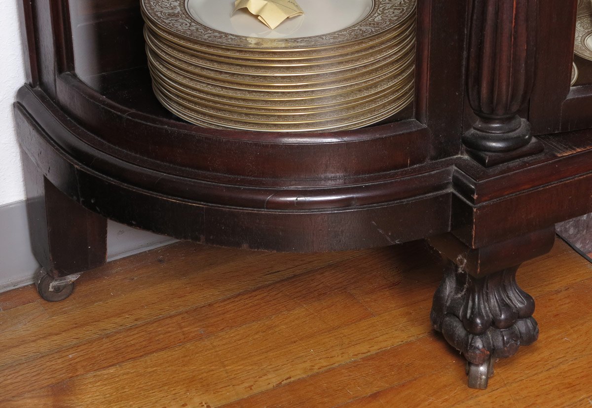 LATE VICTORIAN MAHOGANY BOWFRONT CHINA CABINET: Carved half column decoration, 4 interior shelves. Carved front paw feet, all on castors. 71 1/4'' h. x 54'' x 16 1/2''.