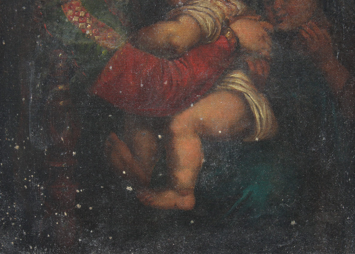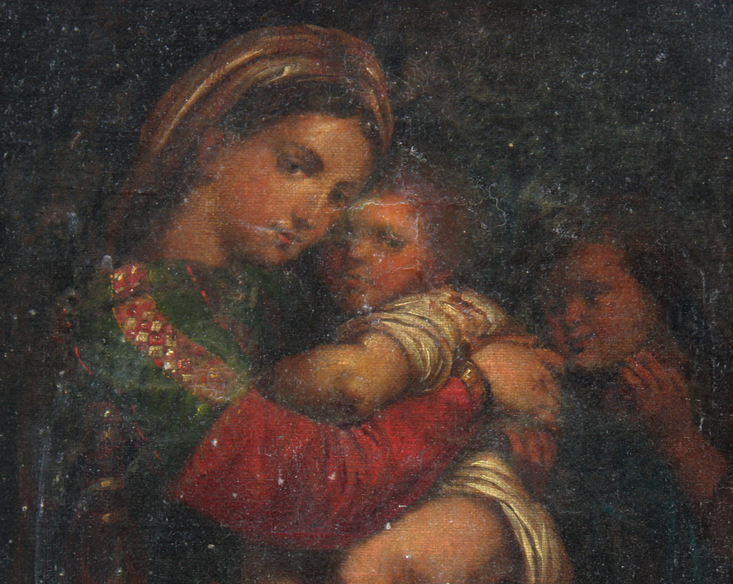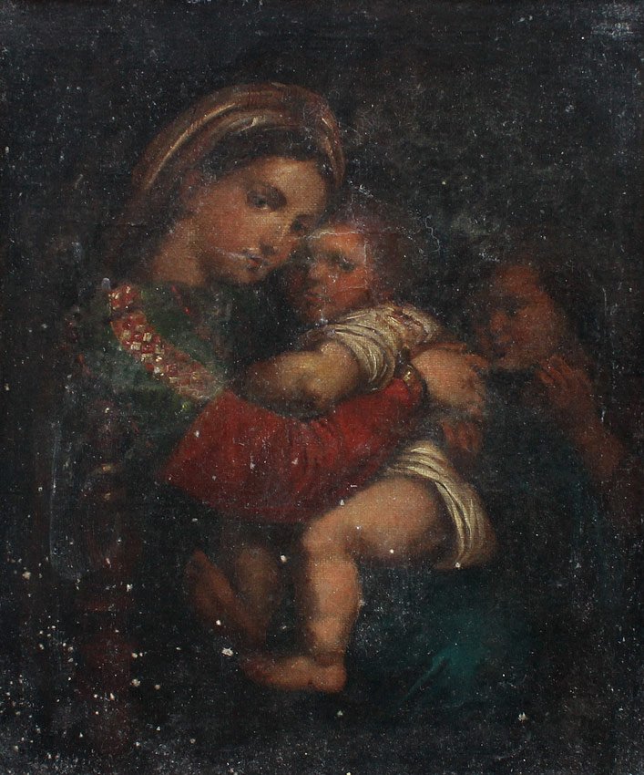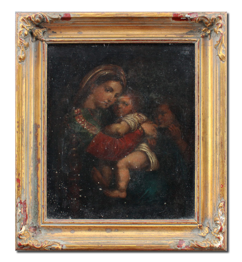 GOOD MADONNA & CHILD 19th CENTURY PAINTING AFTER RAPHAEL: Oil/Canvas, 11 1/2'' x 9 3/4'', no visible signature, encased in a worn gilded frame, 14 3/4'' x 13 1/4''.