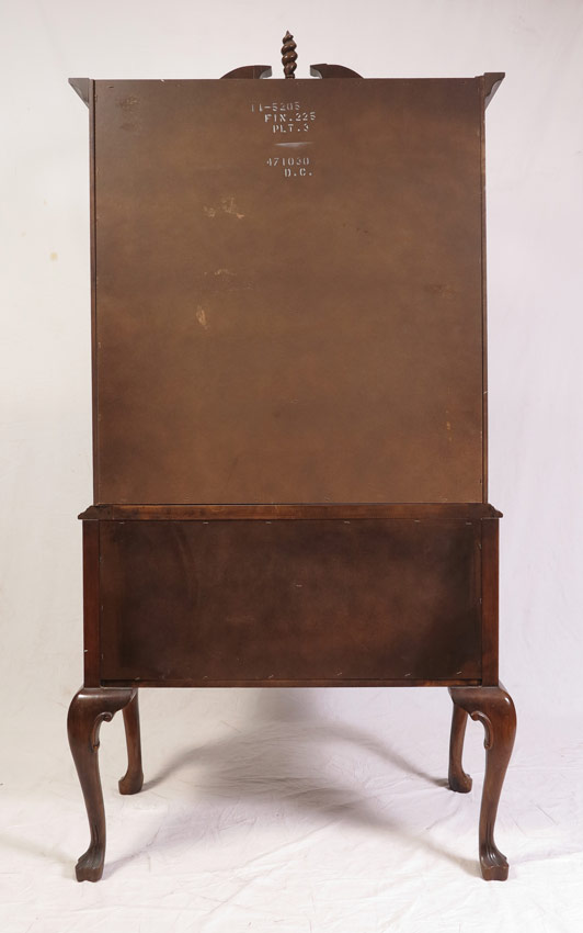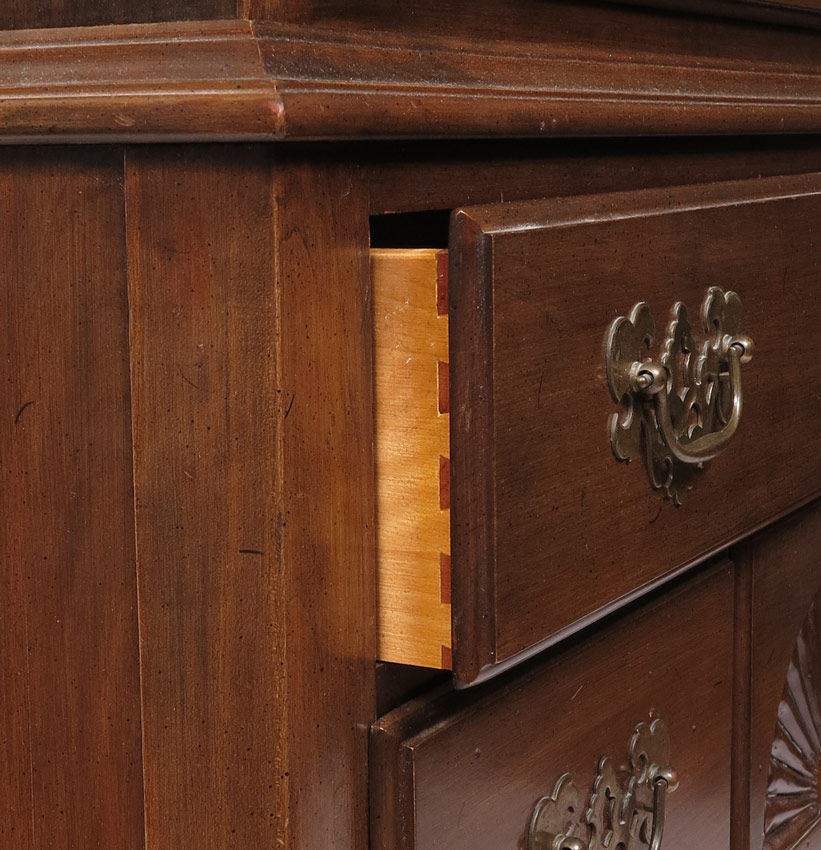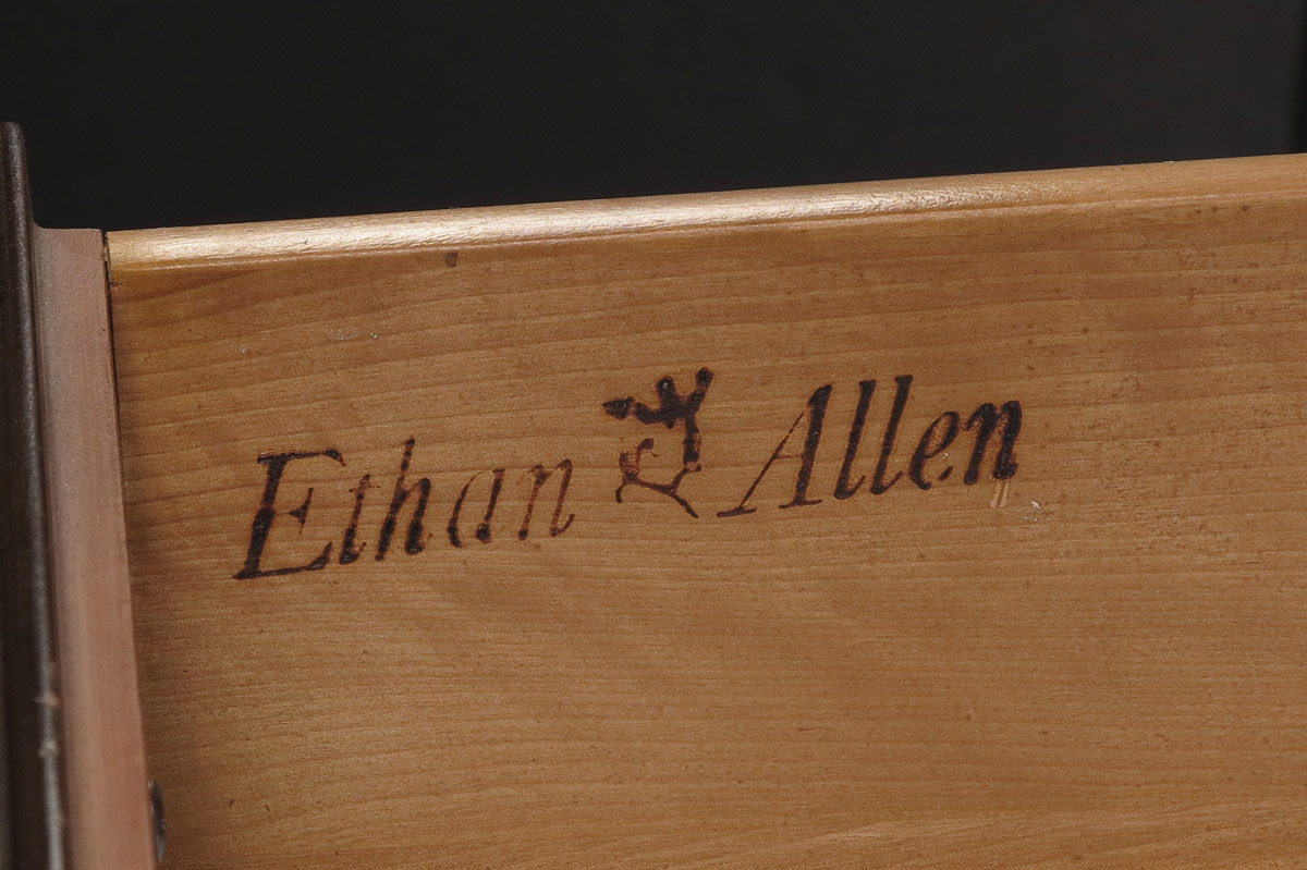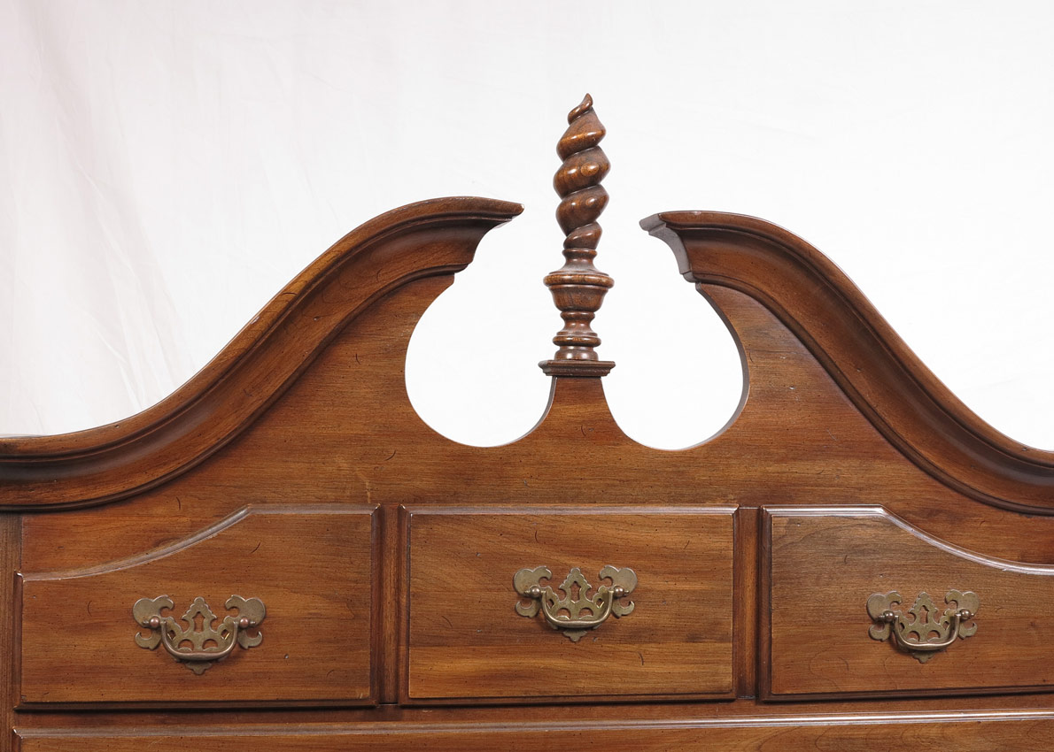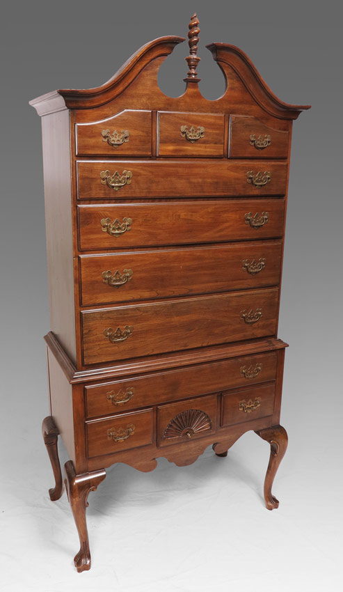 ETHAN ALLEN QUEEN ANNE STYLE HIGH BOY: Broken arch pediment with spire finial. Top with 3 drawers over 3 graduated full length drawers. Base with full length drawers over 3 drawers, center drawer with carved fan front. Shaped skirt, carved and shaped legs. 79 1/4'' h. x 38'' x 21 1/2''.