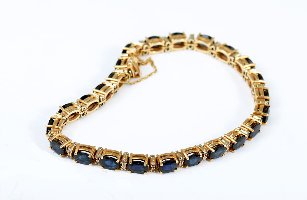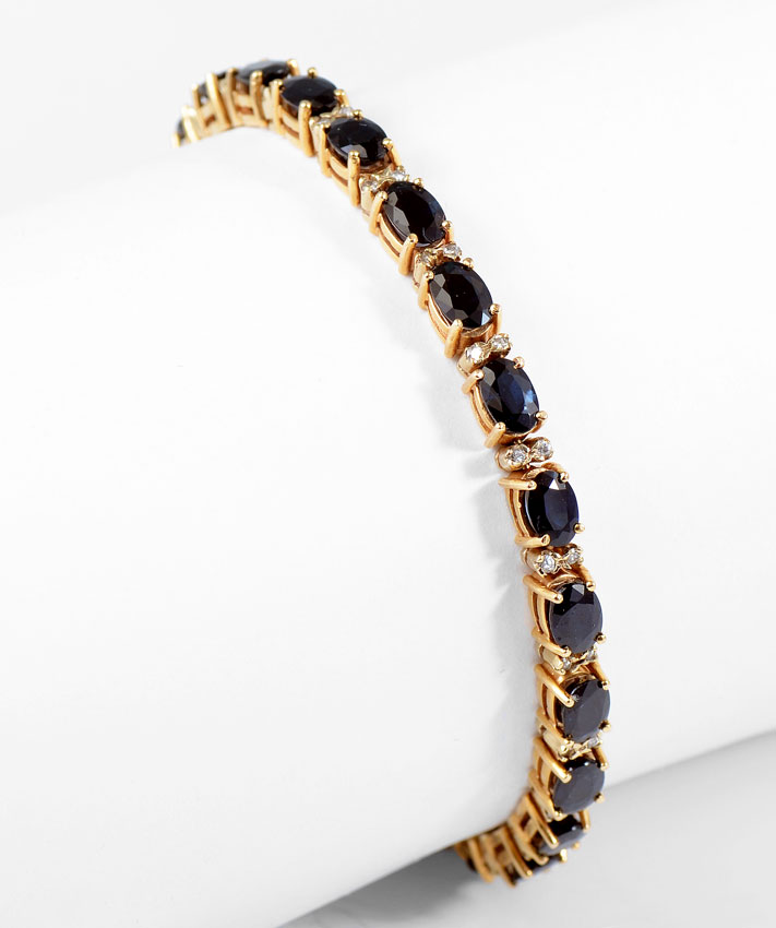 14K SAPPHIRE & DIAMOND BRACELET: 14K yellow gold bracelet contains 24 oval shaped mixed cut sapphires totaling approx. 14.88 Ct. Rated VS-SI in clarity (Type II), B-slgB in Hue, 7 in Tone and 3 in Saturation. 48 round single cut and brilliant cut diamonds. Weight: .50 Ct. Approx. Rated SI in clarity and H-I in color. The sapphires and diamonds are prong set. Locking closure with hidden hinged safety clasp and safety chain. Weight: 17.1 grams. Length: 7.5''