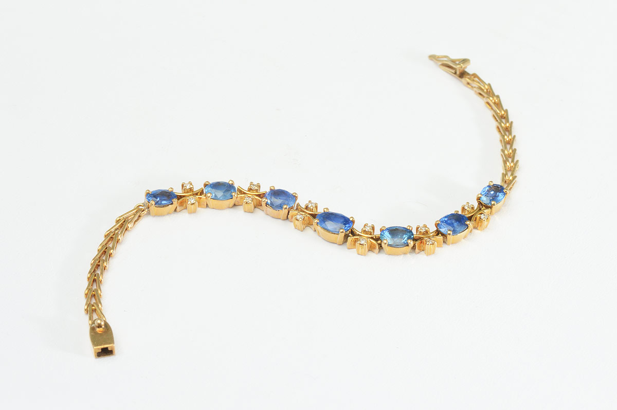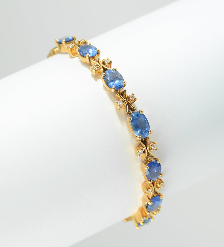 SAPPHIRE & DIAMOND BRACELET: 14k yellow gold bracelet of 7 oval shaped mixed cut sapphires of the bluest blue, totaling approx. 6.19 Ct. The 12 round brilliant accent diamonds total approx .18 Ct. Length 6''. Weight 11.8 grams. Sold with current Atlanta Gemological GIA graduates appraisal for $2,850.