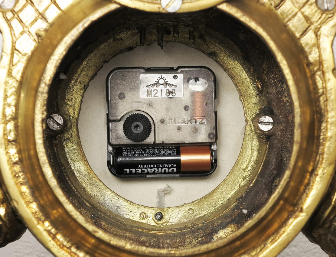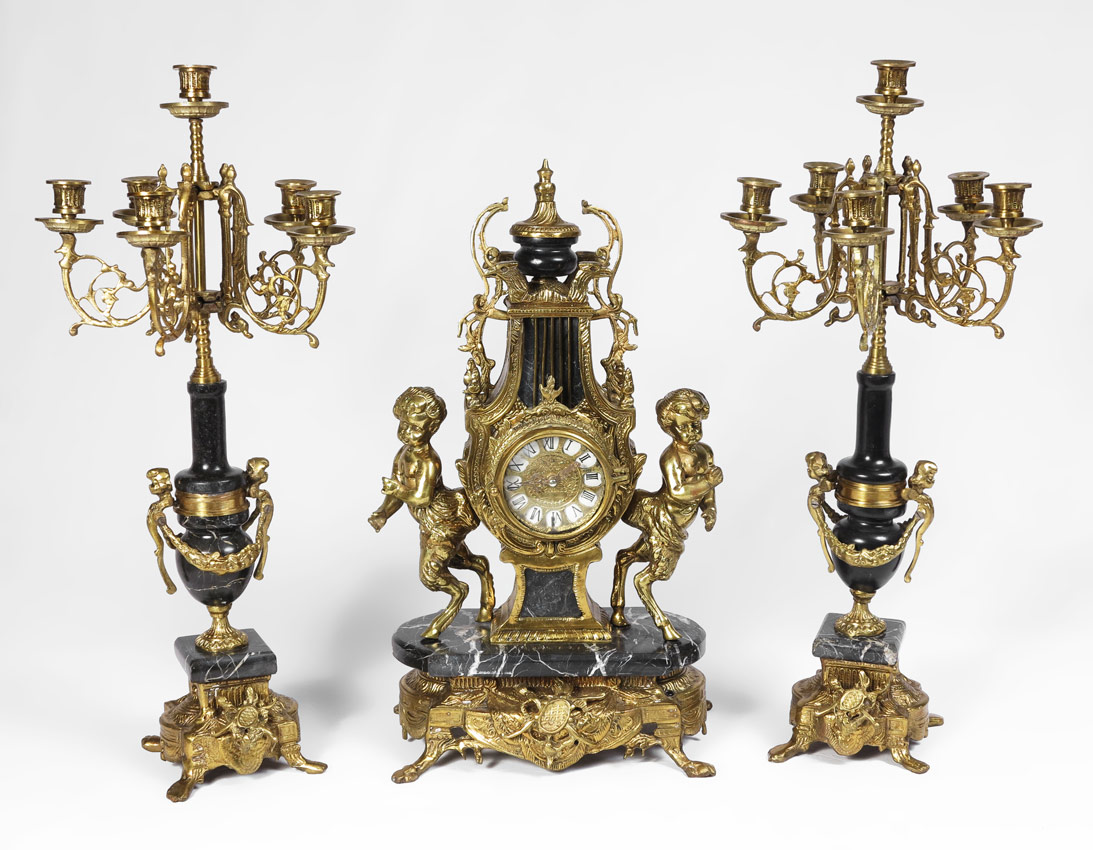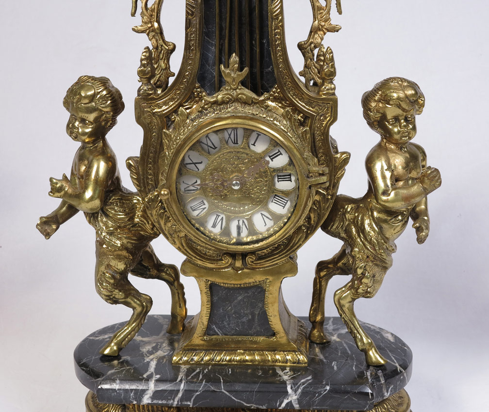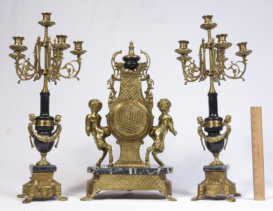 GILT METAL & MARBLE FIGURAL CLOCK GARNITURE SET: Clock with gilt cast metal Pan figures, cast base and marble shelf and accents. Lyre shape case, quartz movement. Unmarked as to maker or retailer, we have seen many of these examples marked Imperial. 21 1/2'' h. x 11 1/2'' x 7 1/2''. Sold with matching 6 light candelabra garniture, 15'' h. x 10 1/2''.