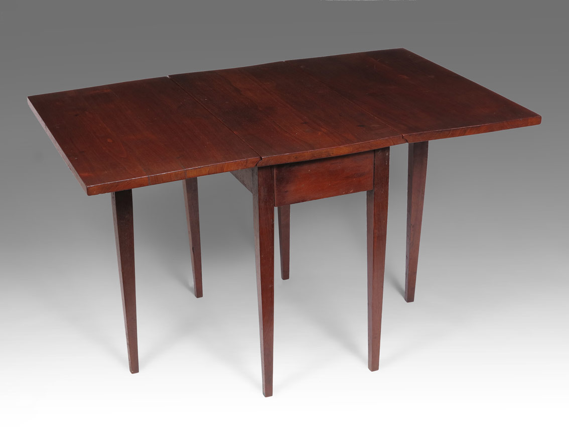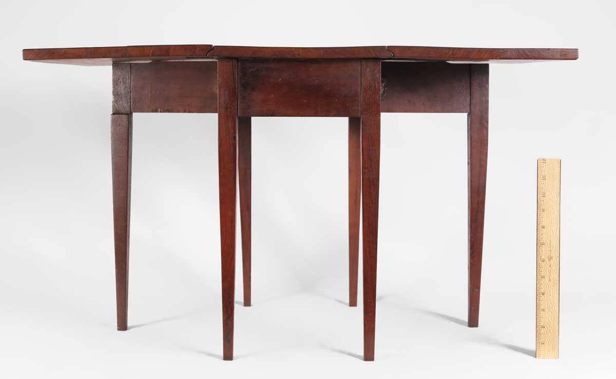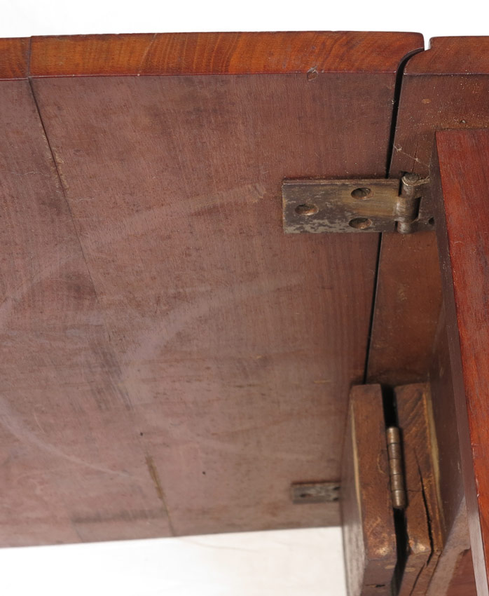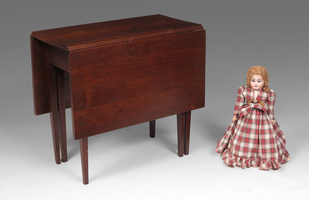 EARLY SALESMAN'S MAHOGANY DROP LEAF TABLE: Possibly for a child or doll, a miniature version of the grown up. 18 3/4'' h. x 20 1/4'' x 11 1/4'', each leaf 11''.
